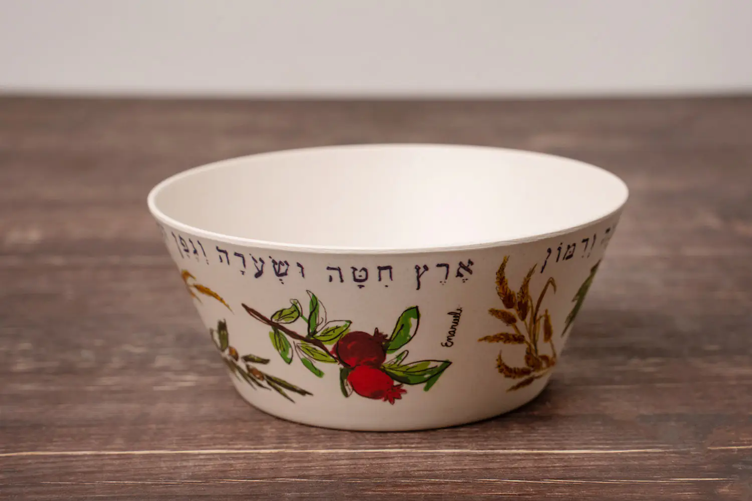 Add a charming touch of the Holy Land to your home with this beautiful eco-friendly small Seven Species Bamboo Bowl with a wooden inner lining, also crafted by Yair Emanuel. The bowl features the seven species from Deuteronomy 8:8, with colorful illustrations and a Hebrew inscription of the Biblical phrase. Its earthy tones and the natural bamboo colors, contrasted with the wooden lining, create a unique and visually appealing piece.