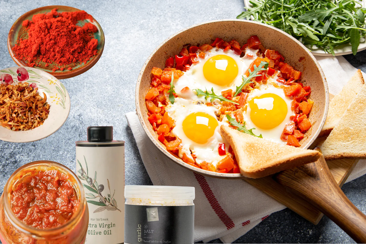The set includes a fragrant shakshuka spice blend, rich shakshuka sauce (375 g), Har Va’Emek extra virgin olive oil, garlic Dead Sea salt in a jar, and sweet paprika (150 g). Together, they transform a humble pan of eggs into a deeply flavorful, satisfying meal that’s perfect for breakfast, brunch, or dinner.