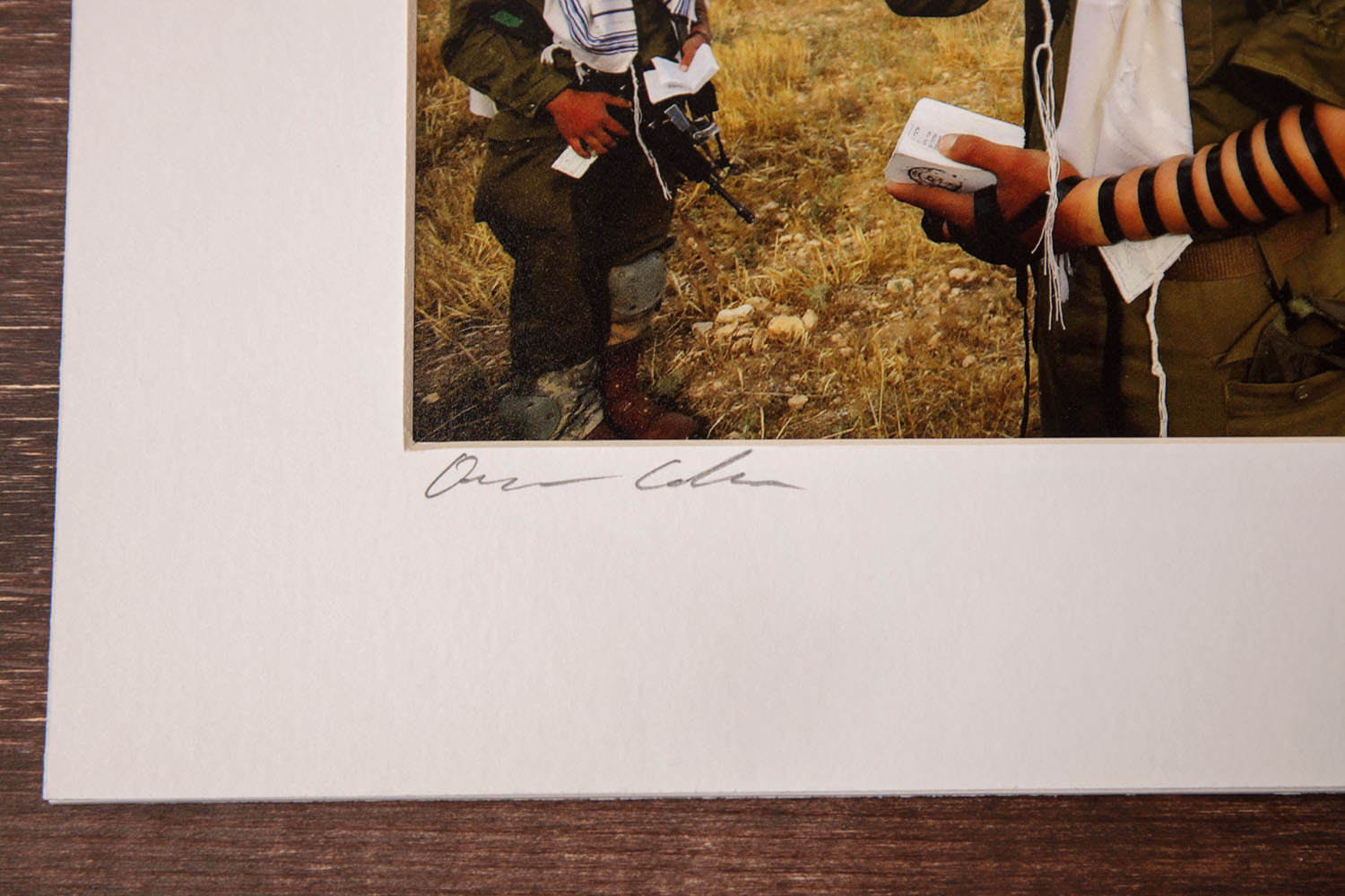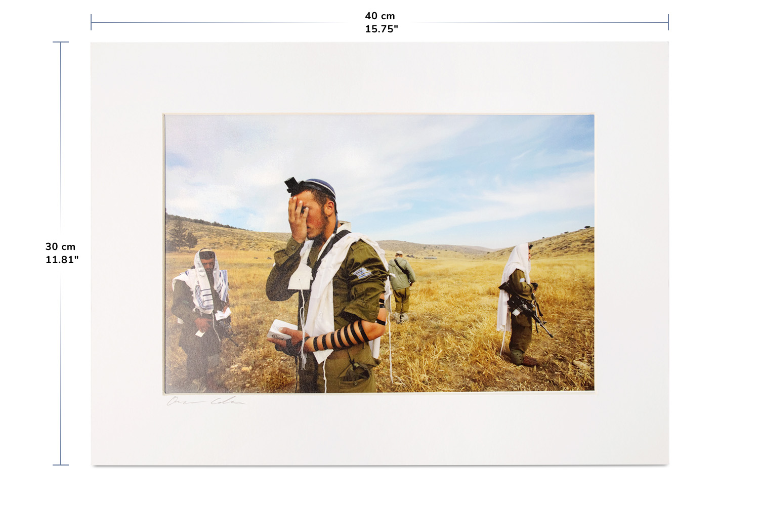 This photograph is part of Oren Cohen’s ongoing work documenting life in Israel with honesty, warmth, and a deep respect for the people who shape its everyday story. A longtime photojournalist and visual storyteller, Cohen has spent years following soldiers, farmers, families, and communities across the country. His eye favors truth over spectacle – and depicts moments that are unguarded, human, and filled with reverence. In Shema, he brings that sensibility forward with striking clarity: the gentle touch of a hand to the face, the lines of tefillin, the tallit catching the light, and the soldiers’ enduring presence in the field.