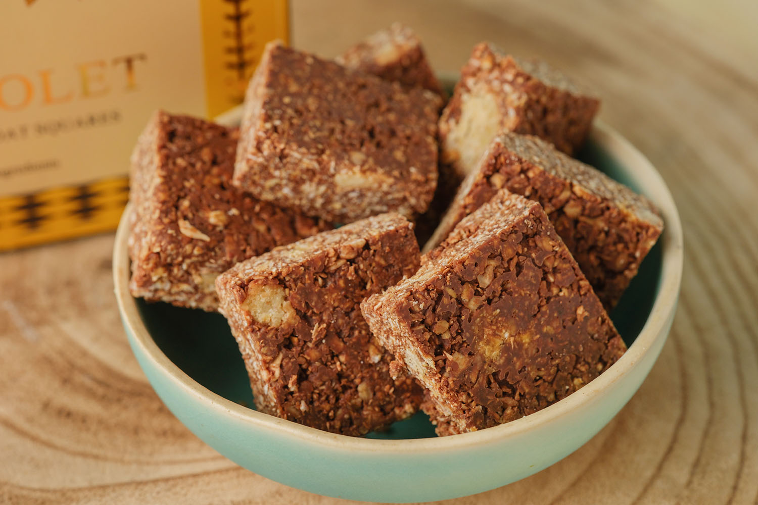 Ingredients: Dark chocolate 72% (32%), oats, cocoa, natural date syrup, raw tahini, coconut, natural raisins.