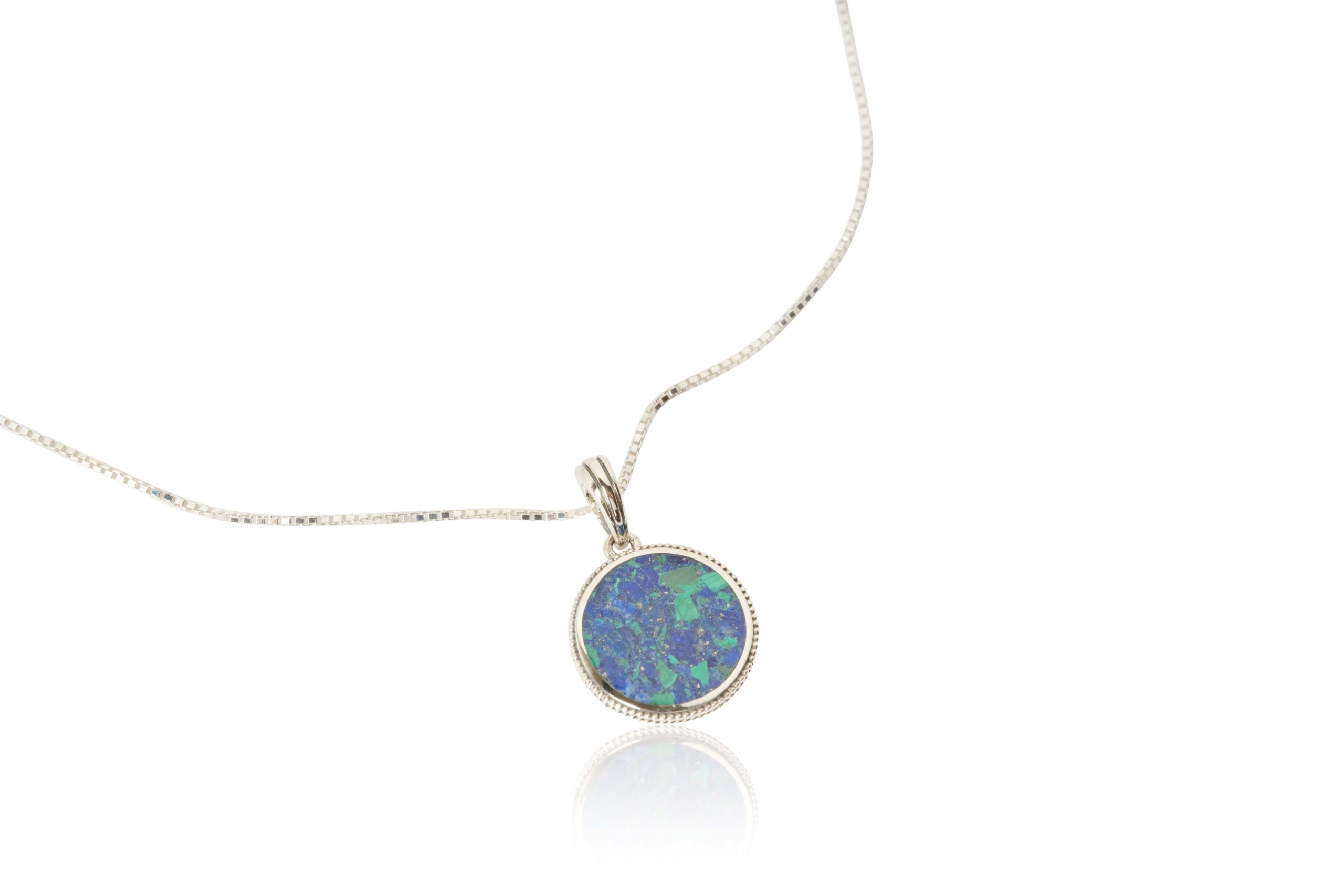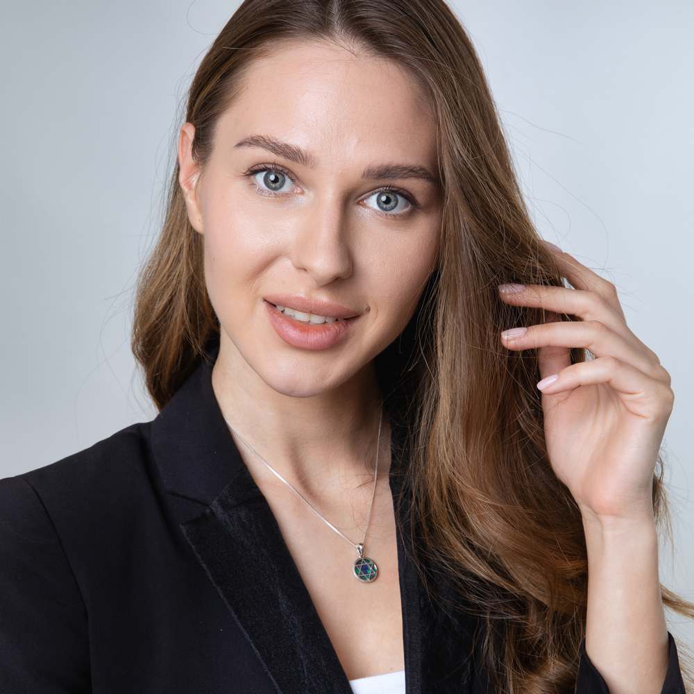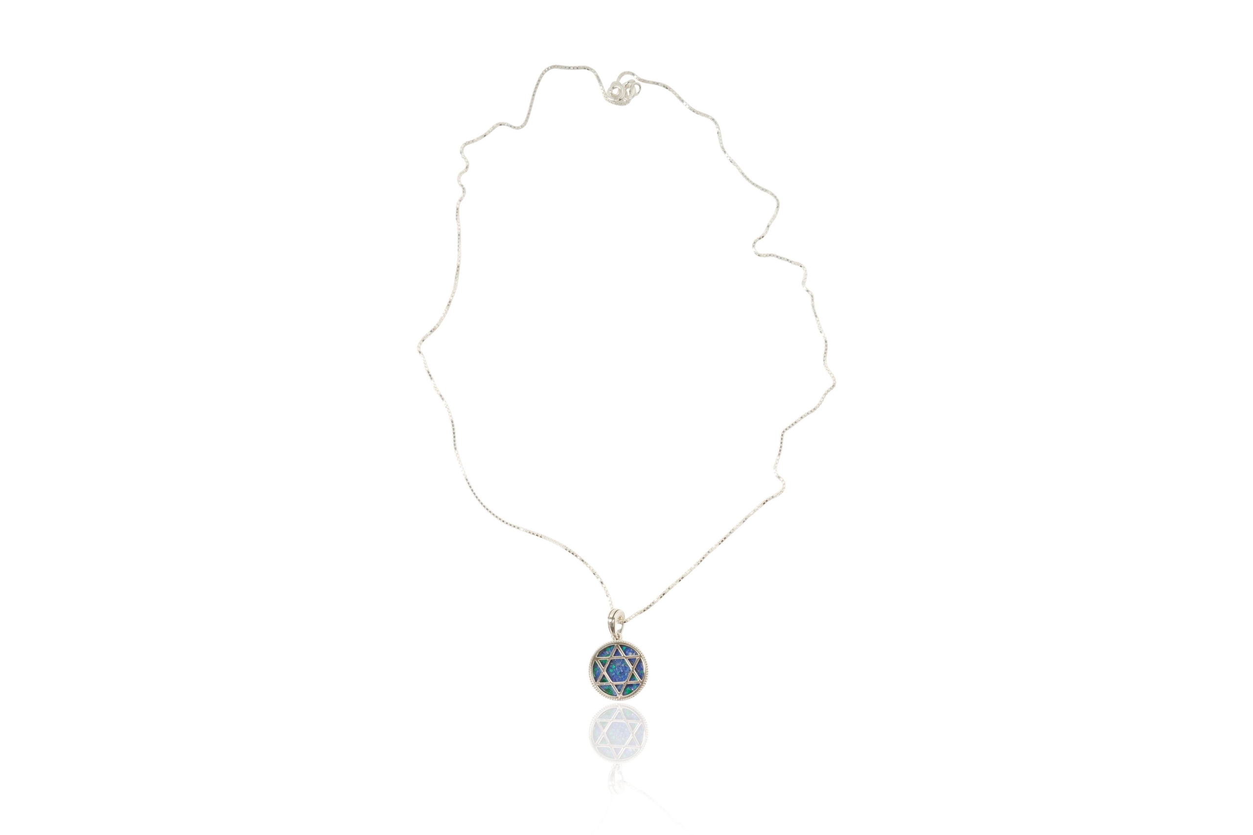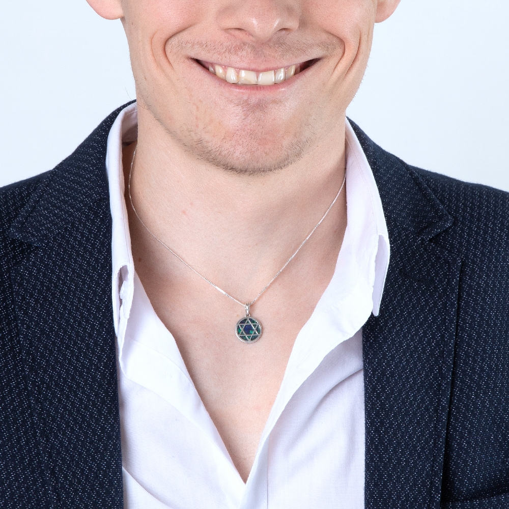 Celebrate your connection to Israel’s ancient heritage with this exquisite Star of David pendant by Marina Jewelry, a brand renowned for its masterful craftsmanship and meaningful designs. This circular pendant showcases a sterling silver Star of David resting gracefully over the vibrant hues of Eilat stone, Israel’s national gemstone.