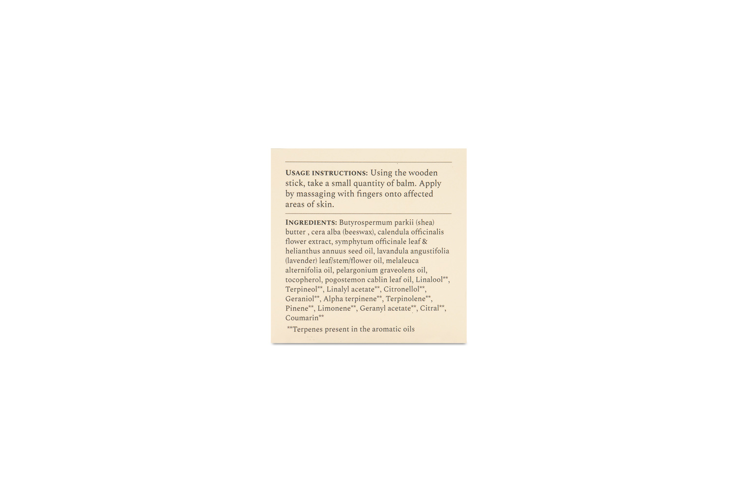Ingredients: Shea butter (butyrospermum parkii), beeswax, calendula officinalis flower extract, symphytum officinale leaf & helianthus annuus seed oil, lavender (lavandula angustifolia) leaf/stem/flower oil, tea tree (melaleuca alternifolia) oil, geranium (pelargonium graveolens) oil, vitamin E (tocopherol), patchouli (pogostemon cablin) leaf oil, linalool, terpineol, linalyl acetate, citronellol, geraniol, alpha terpinene, terpinolene, pinene, limonene, geranyl acetate, citral, coumarin