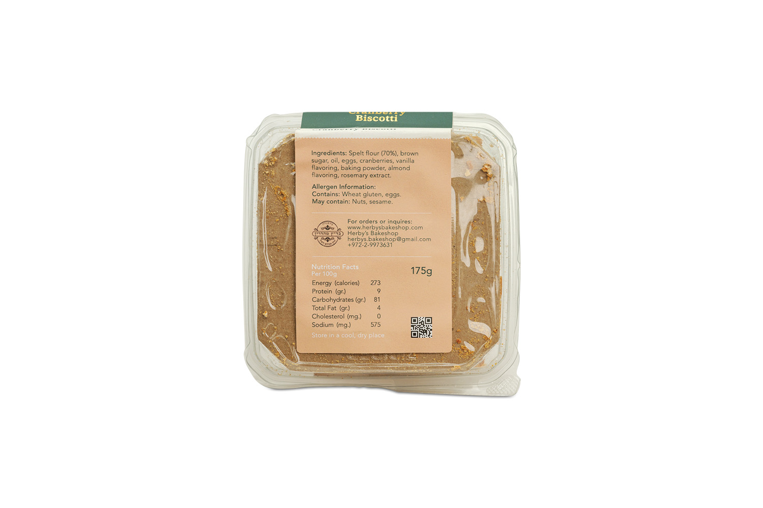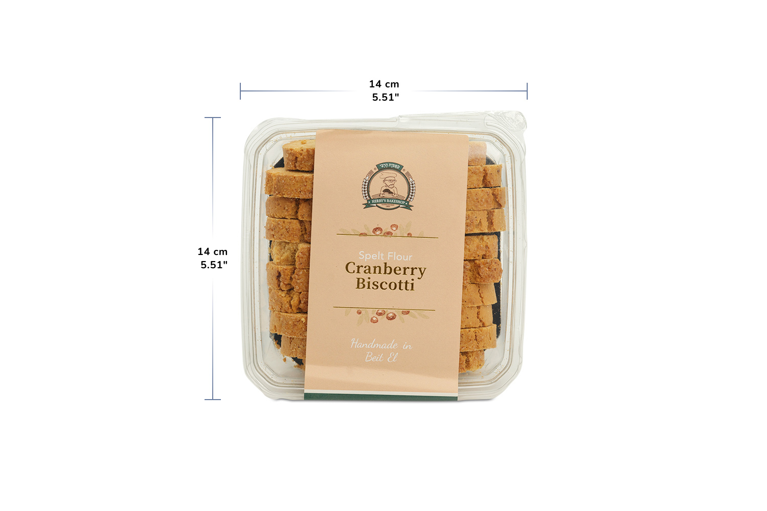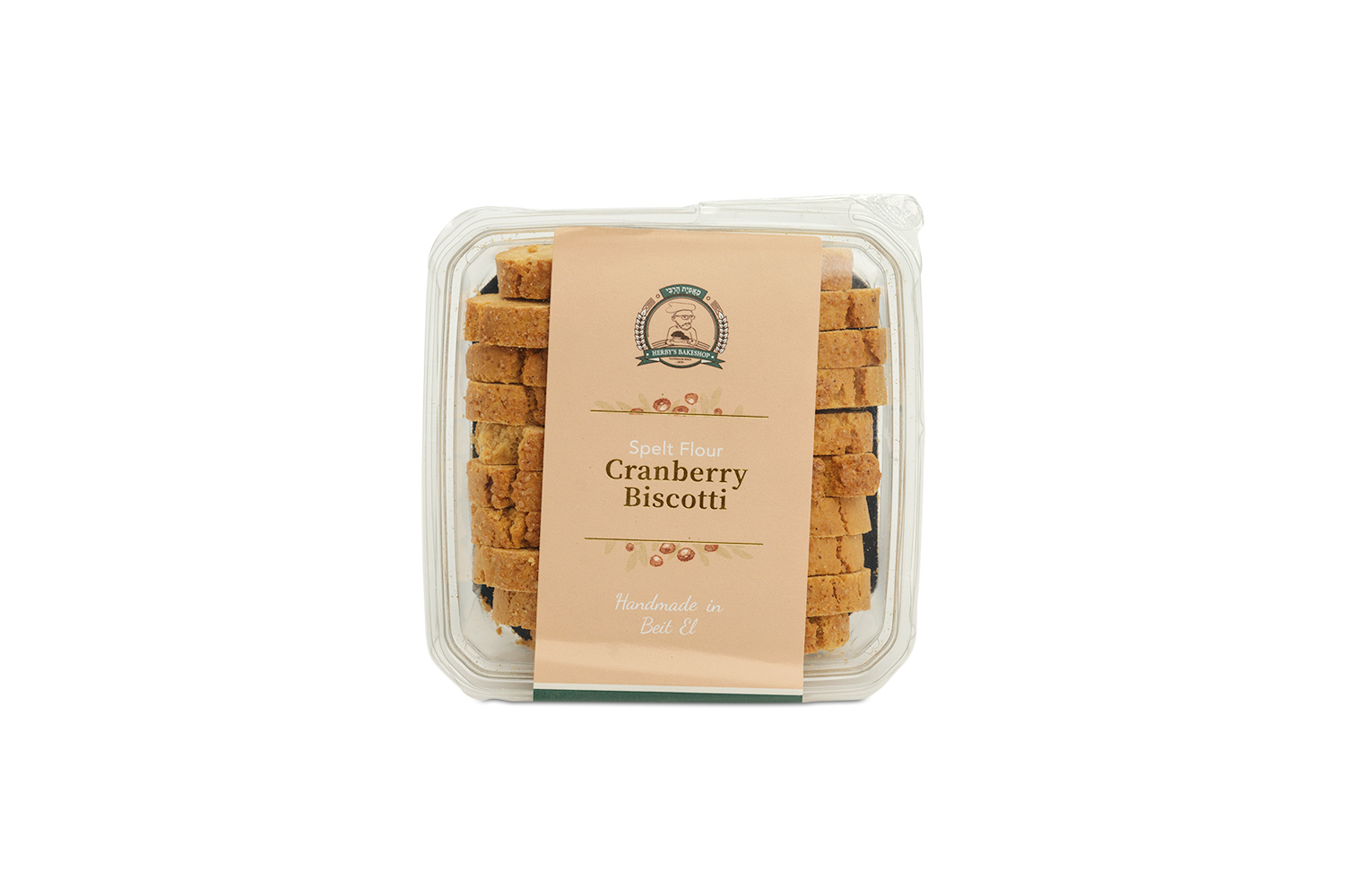 Crisp, golden, and delicately sweet, these biscotti are baked in the hills of Beit El, Israel by Herby’s Bakeshop – a small family bakery known for its handmade creations. Crafted with nutty spelt flour and studded with tangy cranberries, each slice delivers a satisfying crunch that softens beautifully when dipped into coffee or tea. Gentle notes of vanilla, almond, and rosemary add layers of aroma and flavor, while the cranberries provide a brightness that balances the rustic warmth of the biscuit.