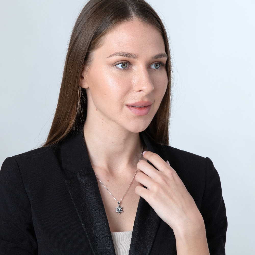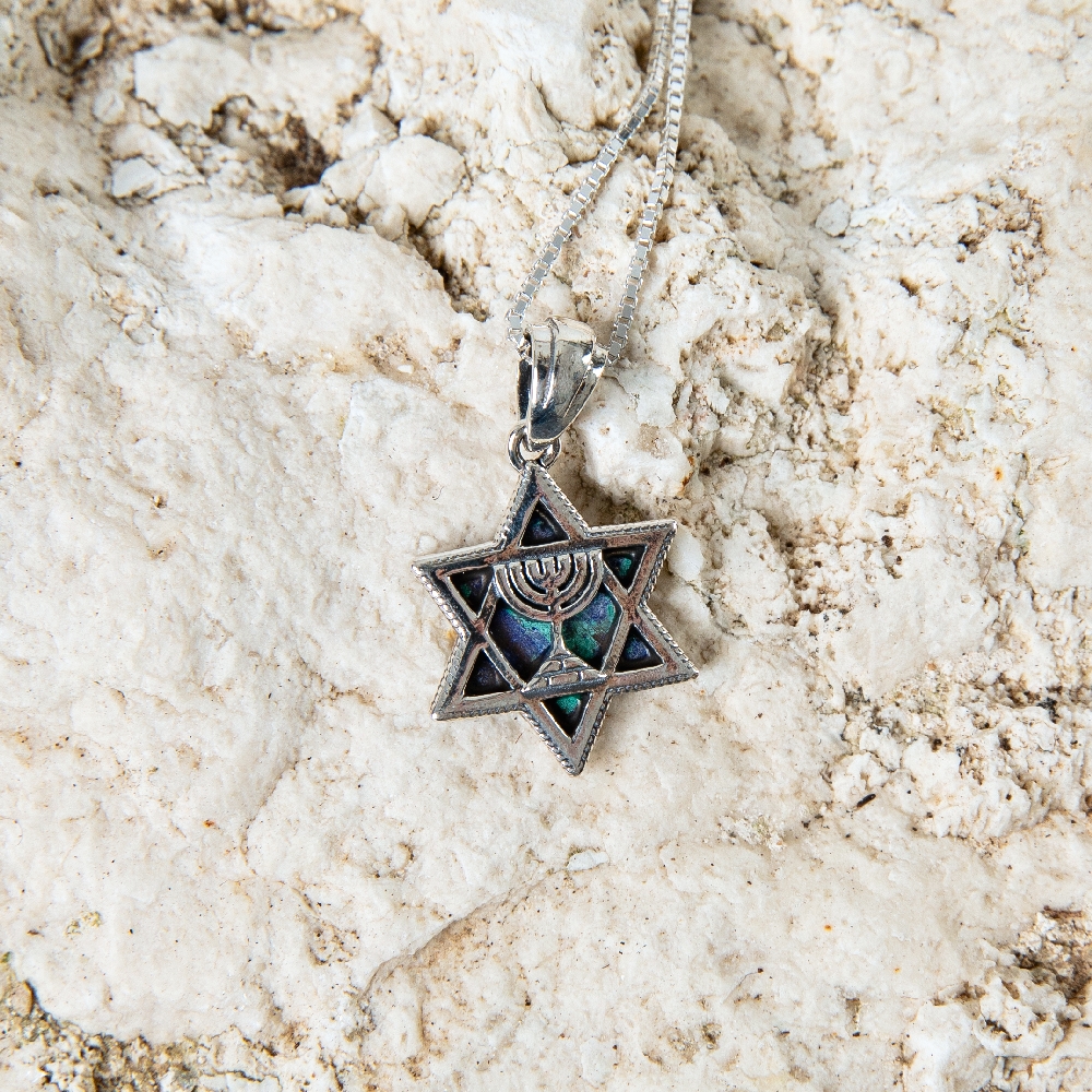 Celebrate the beauty and rich heritage of Israel with this exquisite Star of David pendant, intricately designed to feature a sterling silver Menorah at its heart. The textured Star of David surrounds a vivid Azurite stone, its deep green and blue hues evoking the landscapes of the Holy Land. This pendant not only honors traditional Jewish symbols but also highlights the sacred Menorah, which once graced the Holy Temple in Jerusalem.