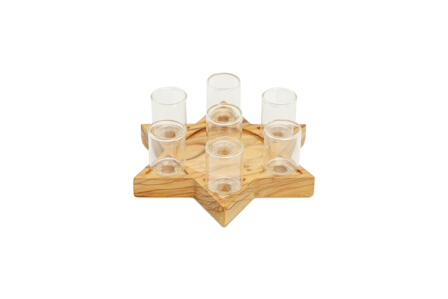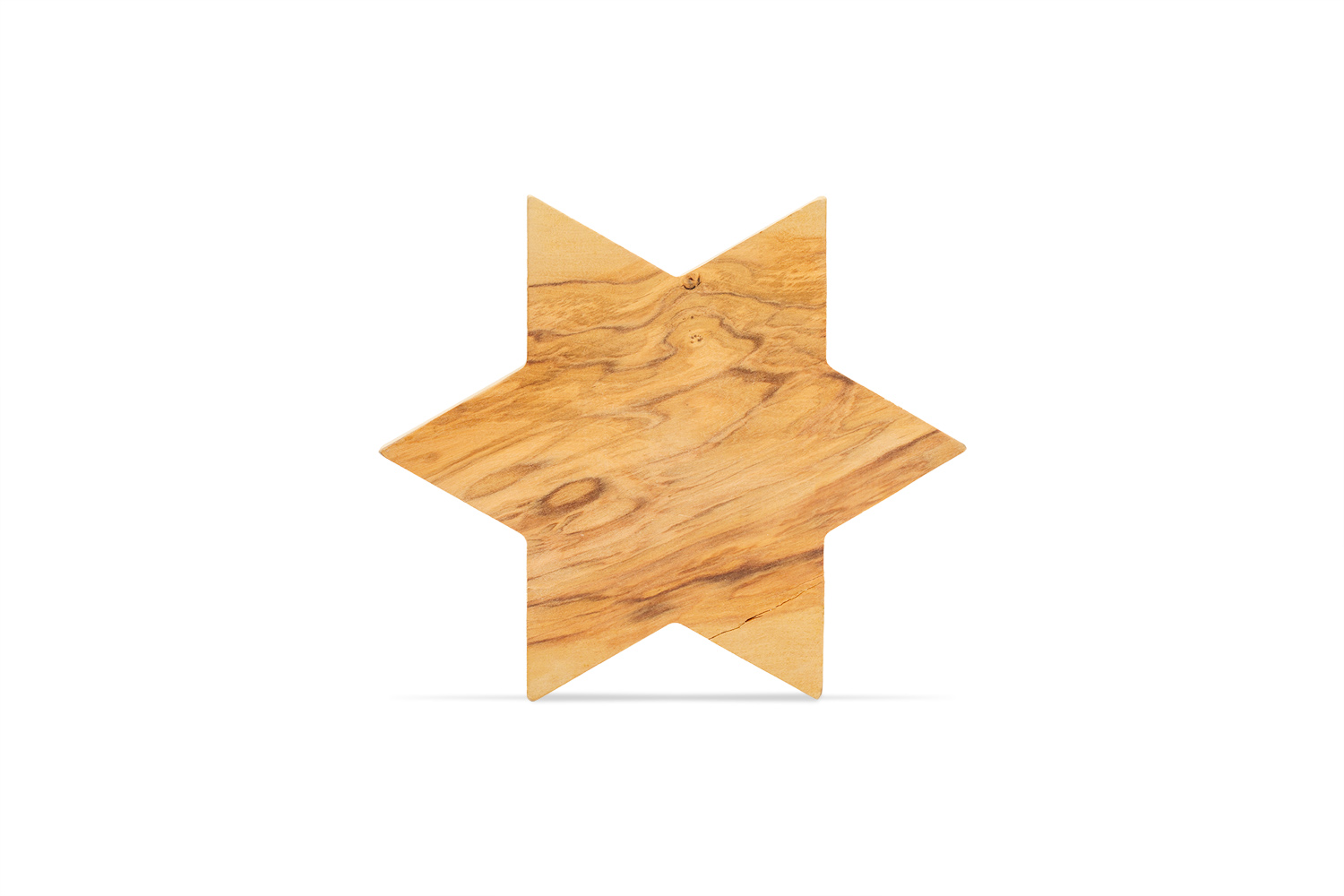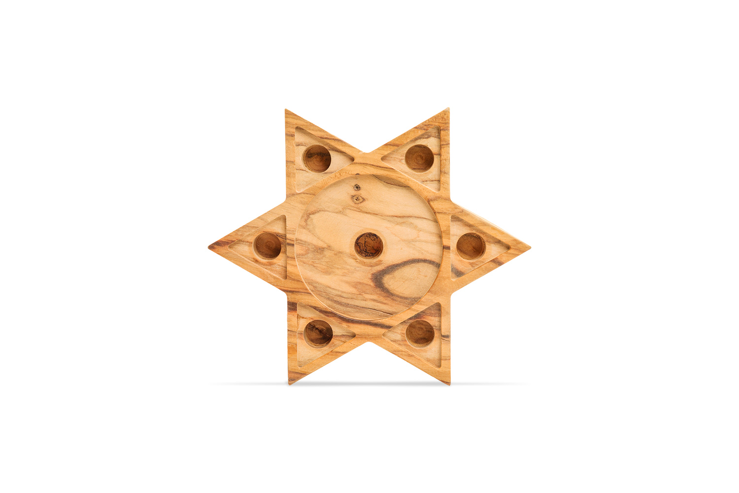 Shaped into a bold, clean Star of David, this candleholder holds small glass inserts that sit neatly in each point of the star. The olive wood base displays soft, flowing grains in shades of honey, sand, and amber, giving the piece a gentle glow even before the candles are lit. Joseph’s approach blends simple geometry with the quiet elegance of natural wood, resulting in a centerpiece that feels rooted in Jewish heritage while fitting beautifully into modern homes.