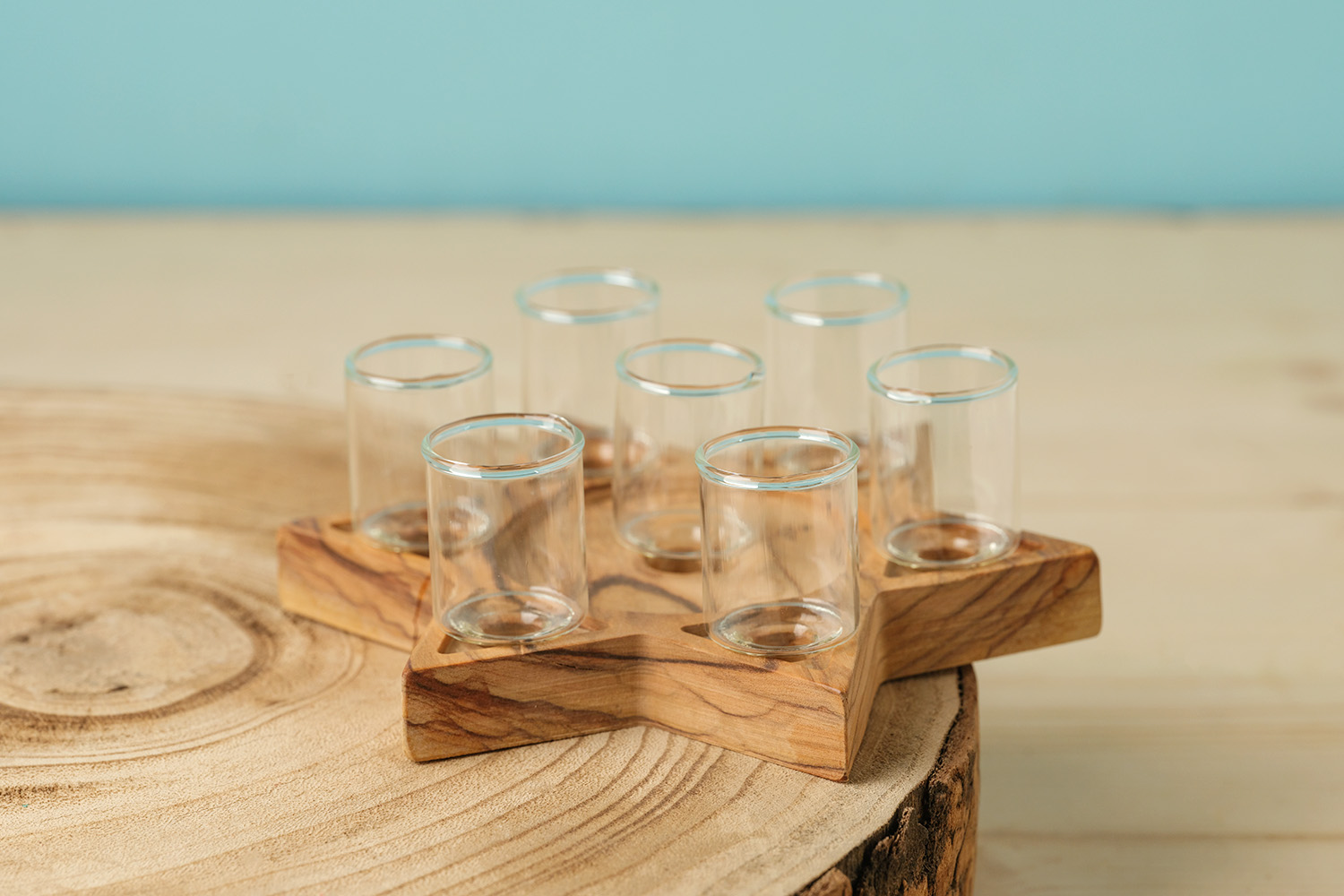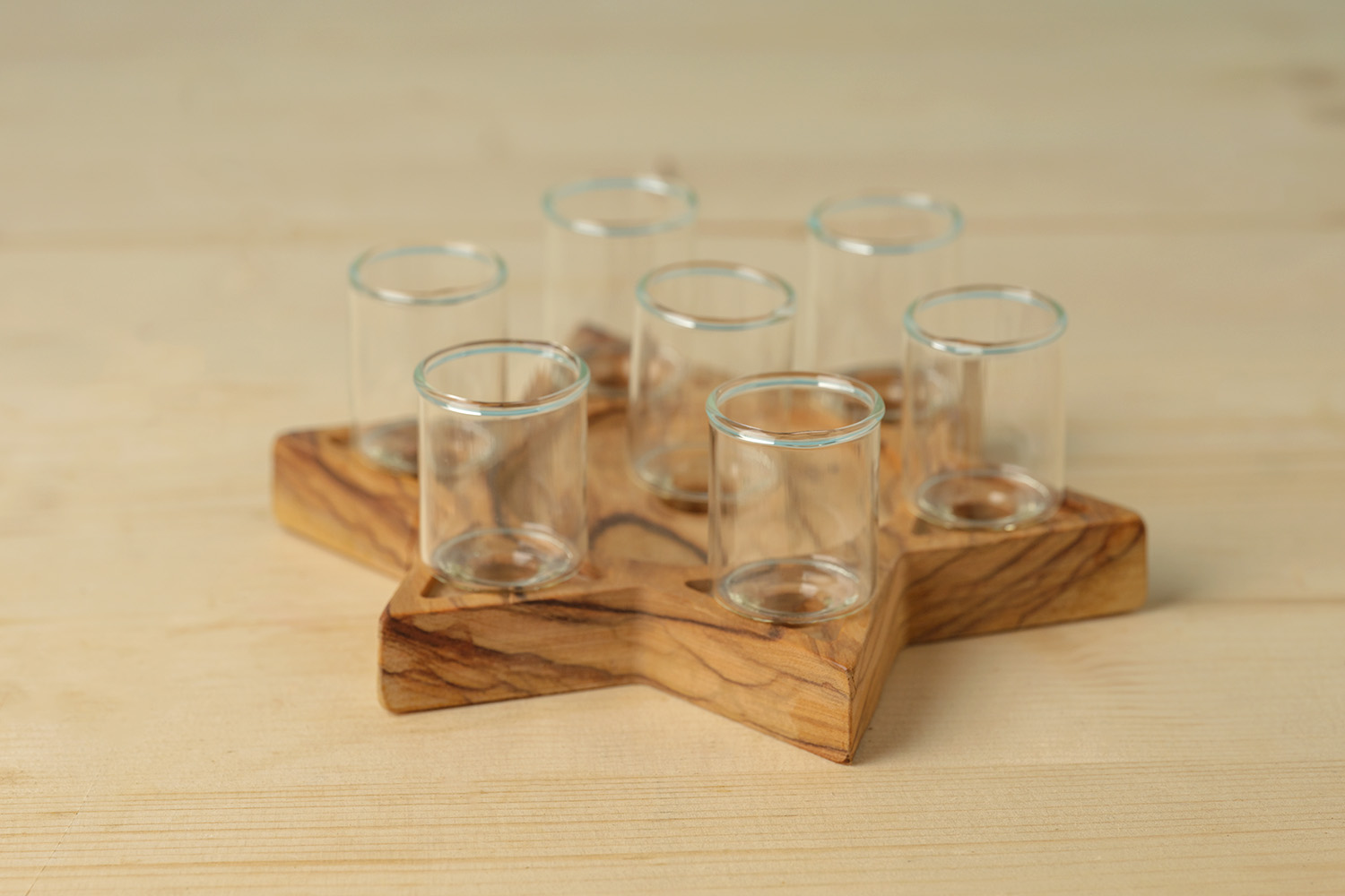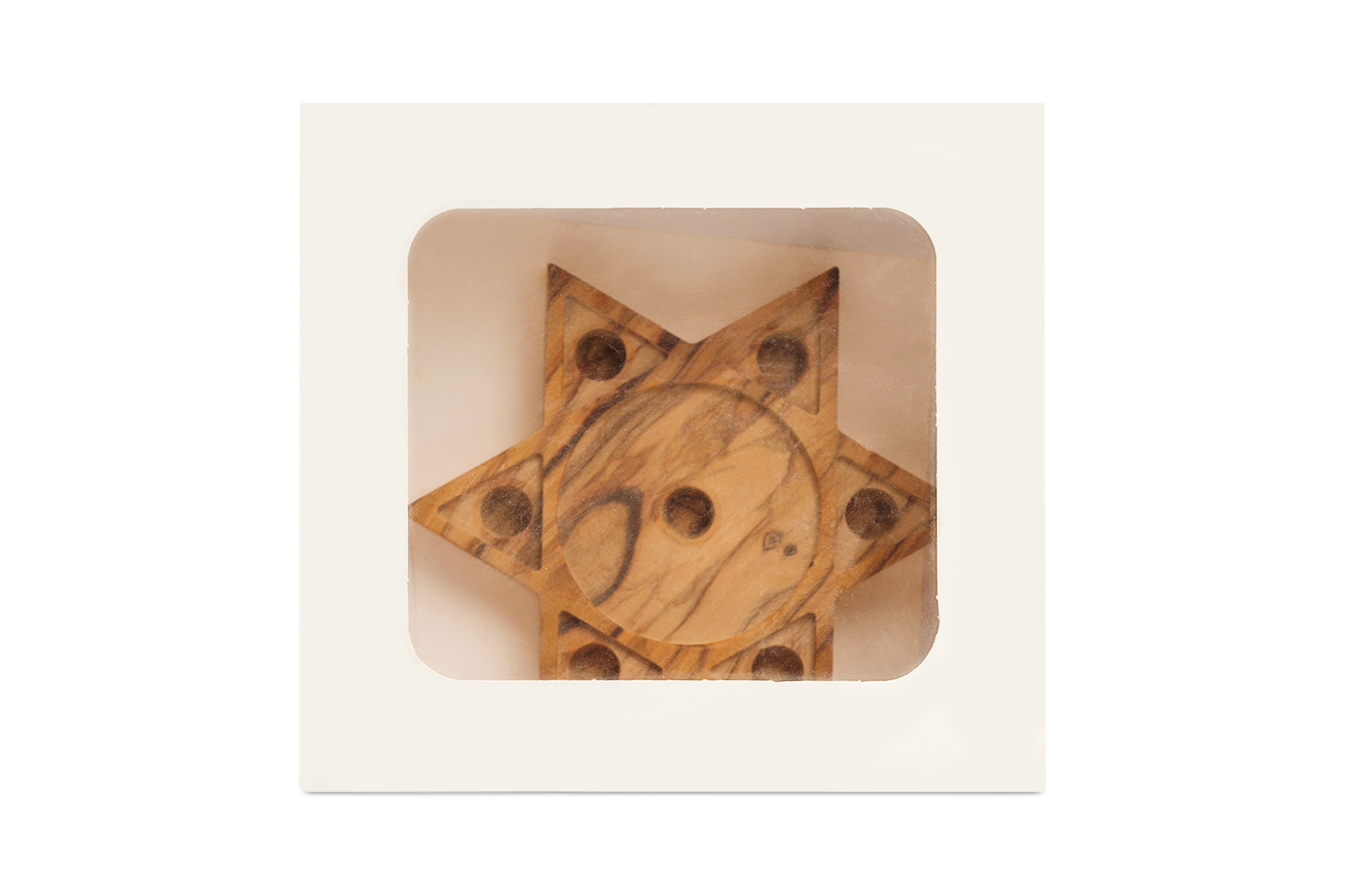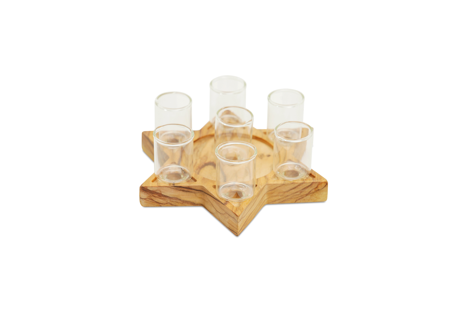 Shaped into a bold, clean Star of David, this candleholder holds small glass inserts that sit neatly in each point of the star. The olive wood base displays soft, flowing grains in shades of honey, sand, and amber, giving the piece a gentle glow even before the candles are lit. Joseph’s approach blends simple geometry with the quiet elegance of natural wood, resulting in a centerpiece that feels rooted in Jewish heritage while fitting beautifully into modern homes.
