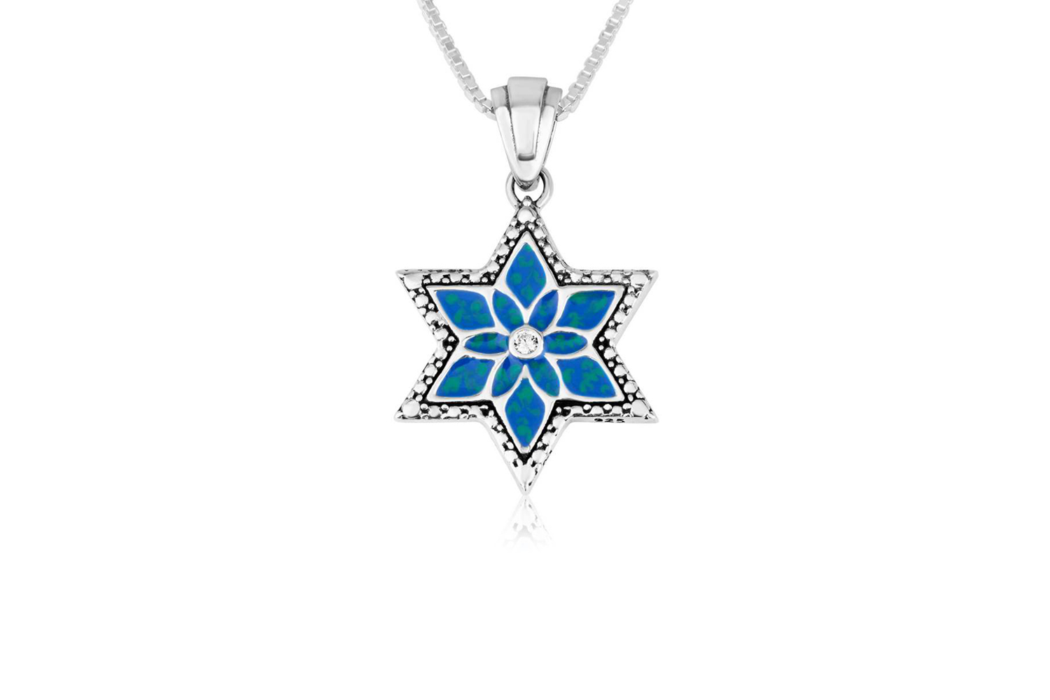 Sterling Silver and Enamel Blue Flower Star of David Necklace