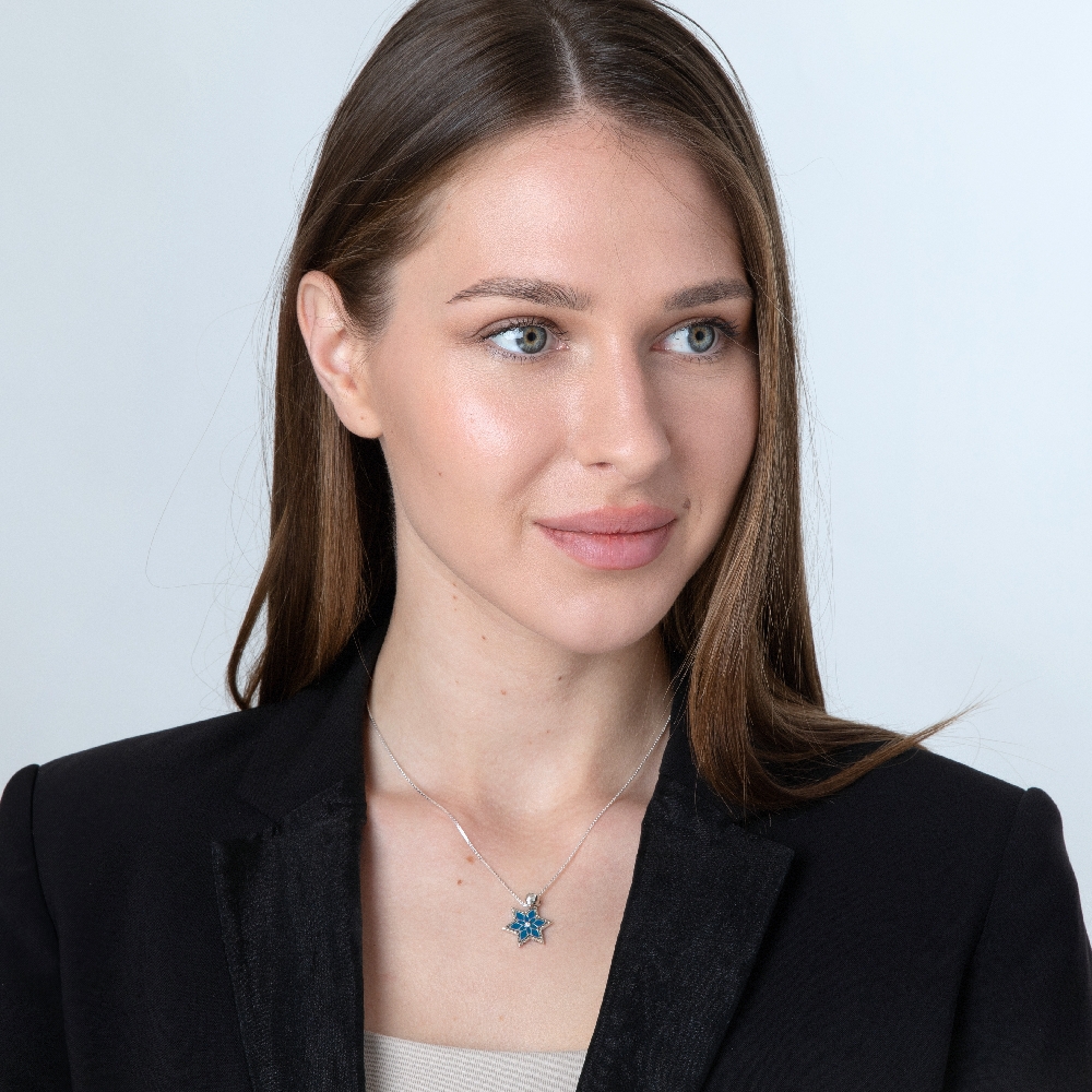 Measuring 0.6” (1.5 cm) in length (including the bail) and 1” (2.5 cm) in width, this pendant is perfectly sized for daily wear or special occasions. The thoughtful craftsmanship is evident in every detail, blending traditional Jewish symbolism with modern design. Crafted from 925 sterling silver, the necklace combines durability with timeless elegance. The vivid blue enamel and radiant cubic zirconia stone add a pop of color and sophistication, while the Star of David symbolizes Jewish identity and faith.