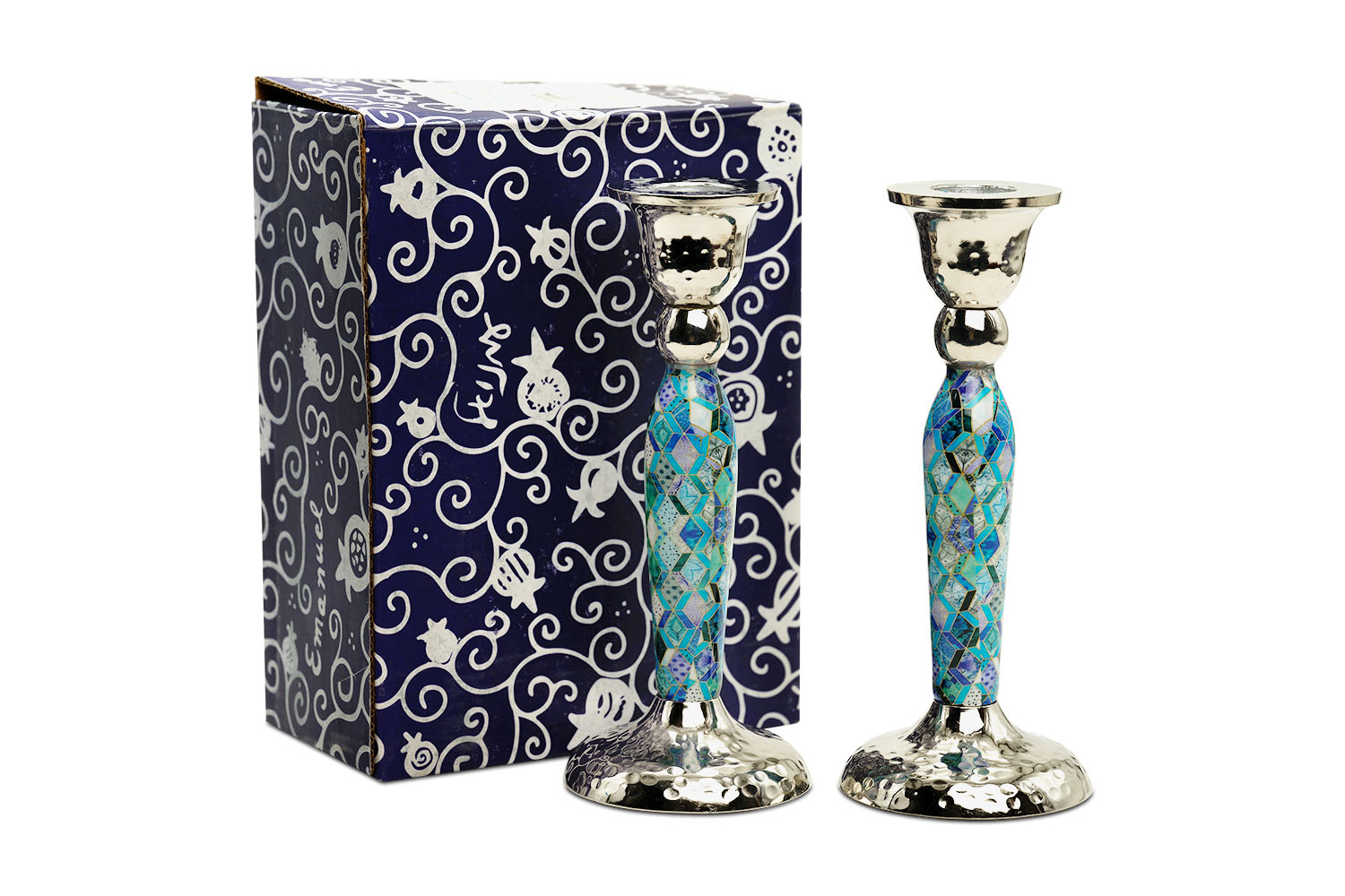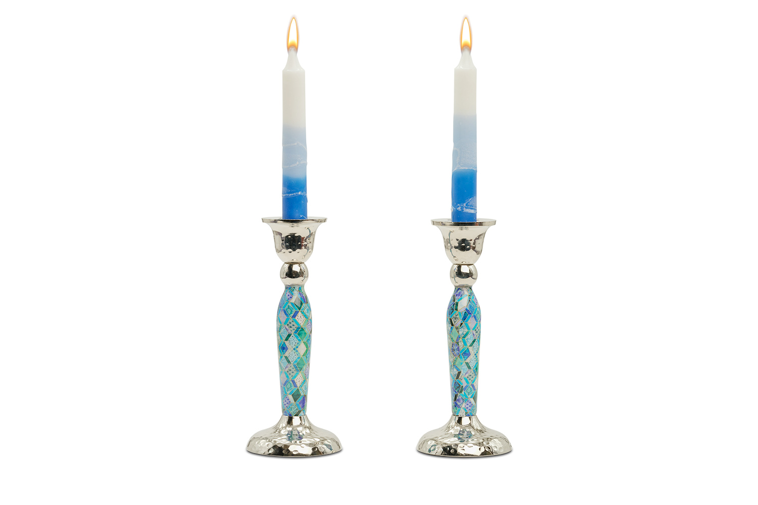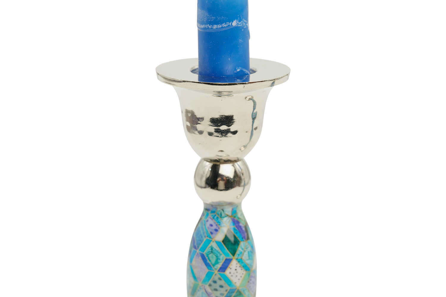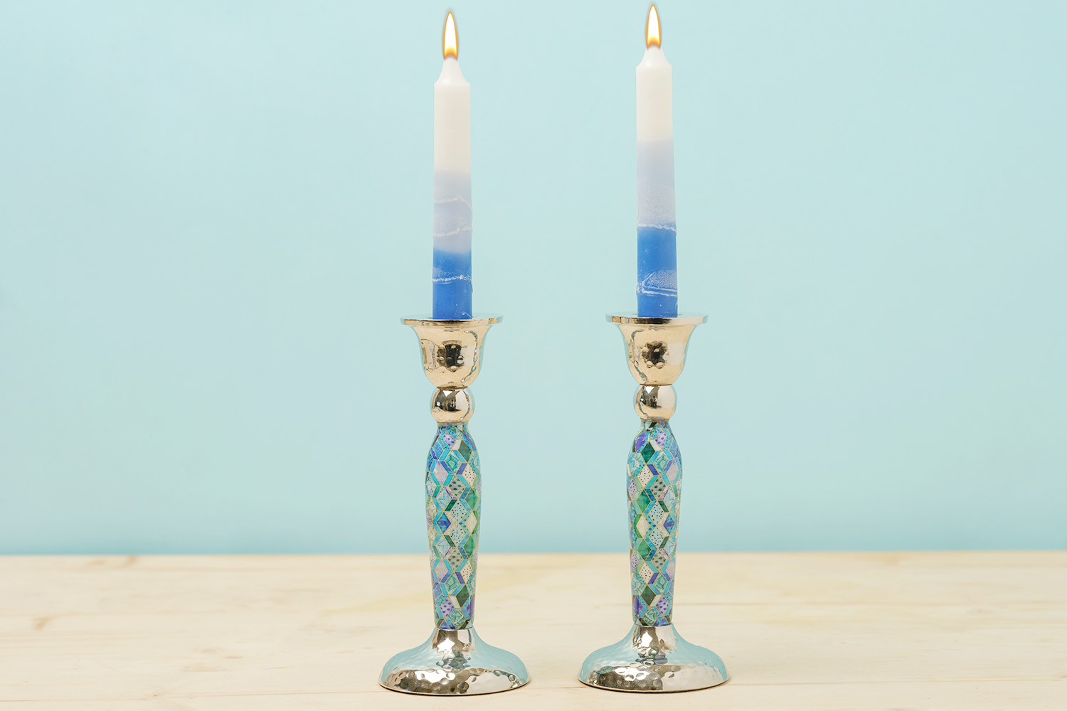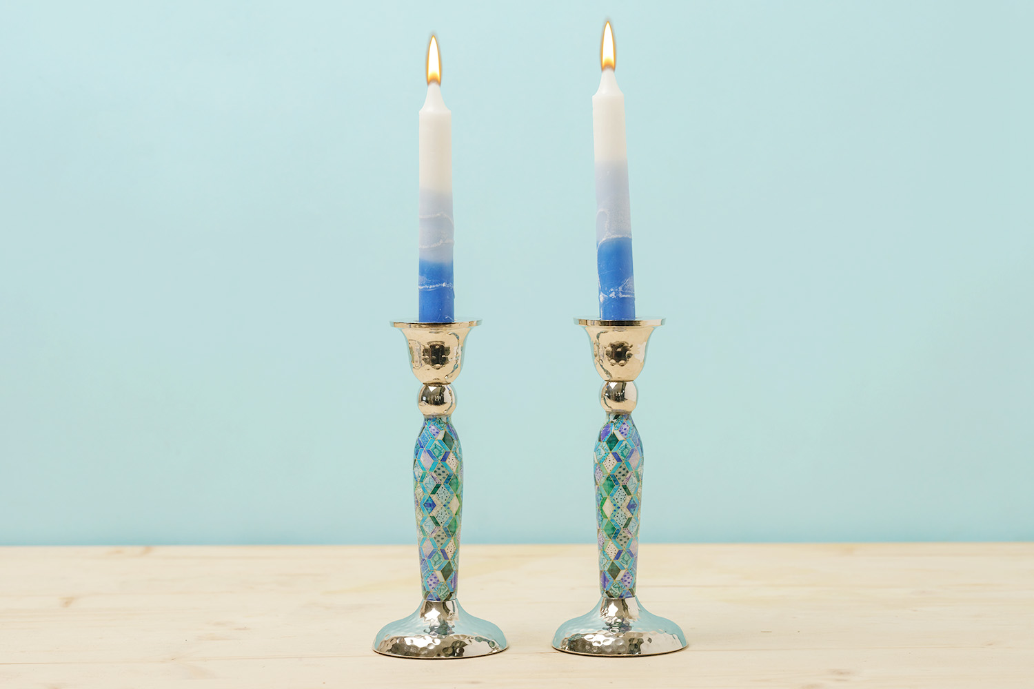 Emanuel has brought his signature charm to these soothing blue enamel and silver candlesticks. They elegantly reflect the light and peace of the Shabbat candles and are designed to hold either a pillar candle or a votive.