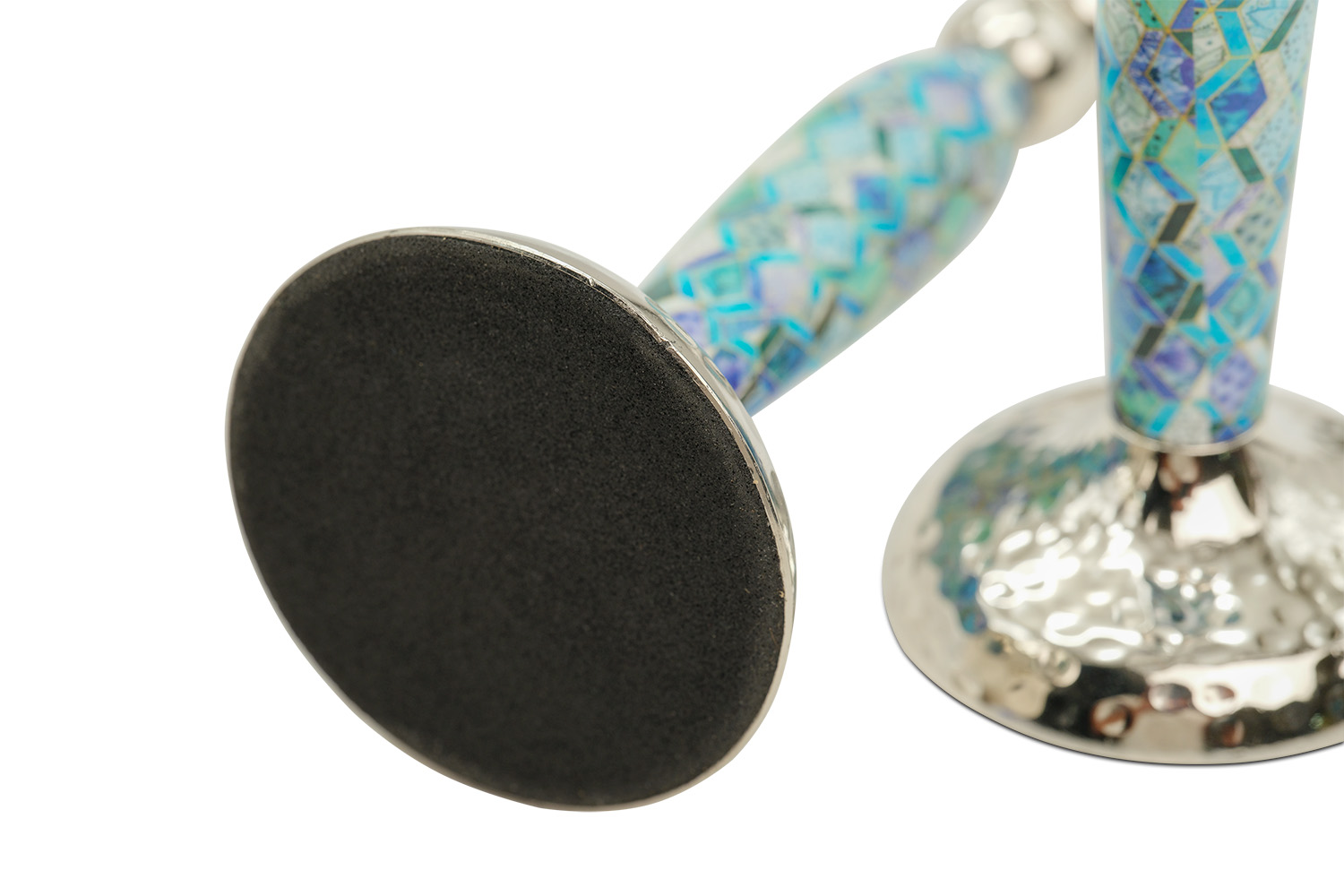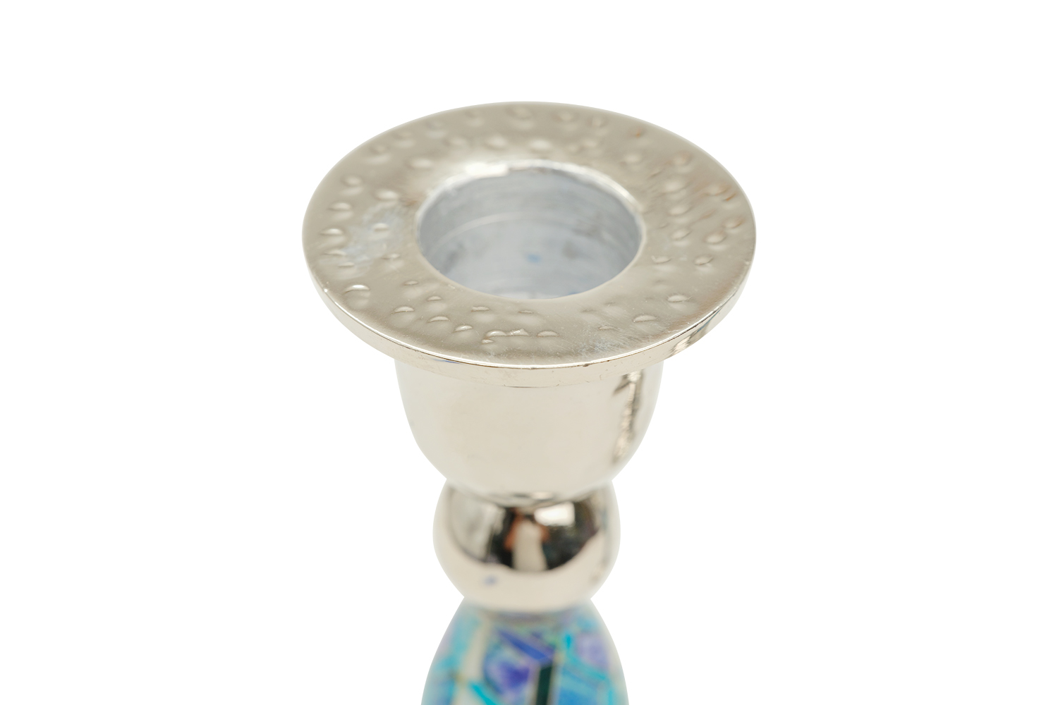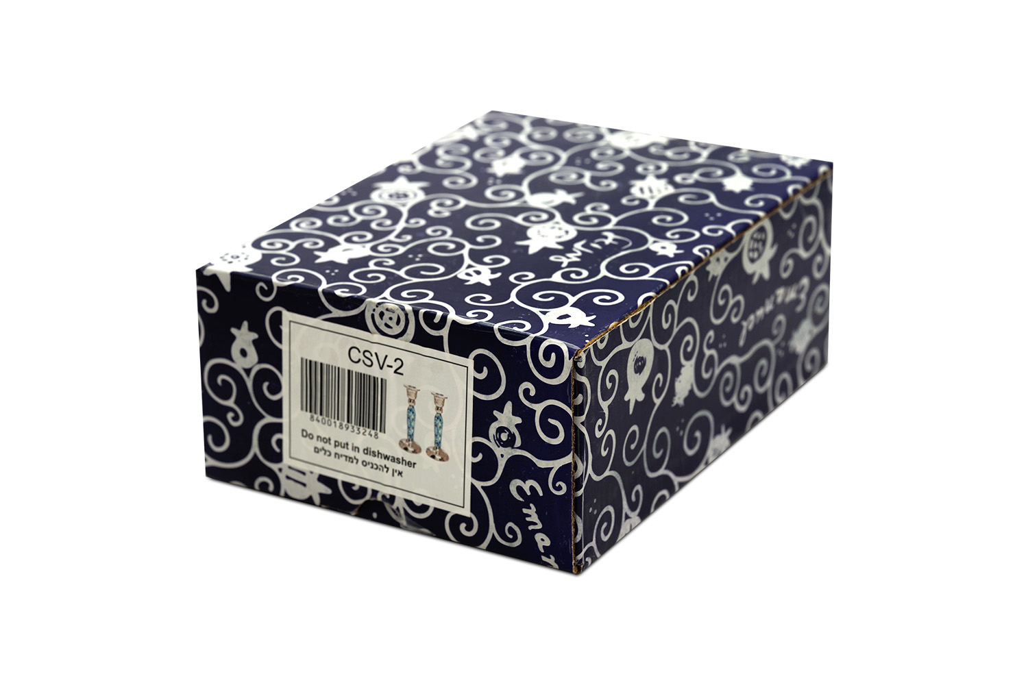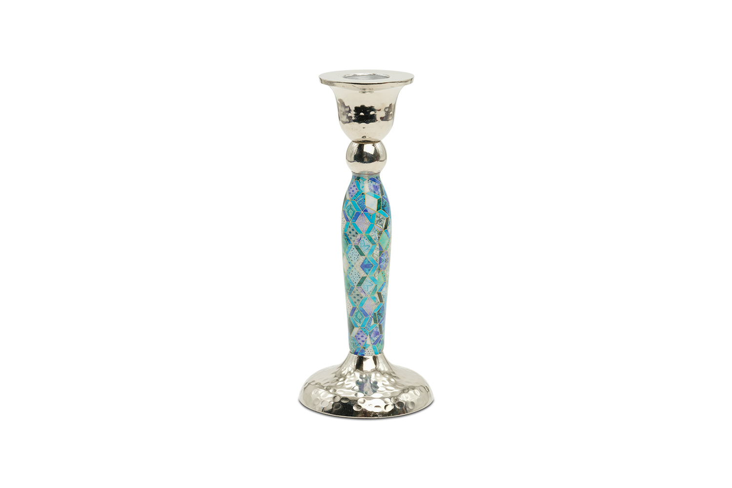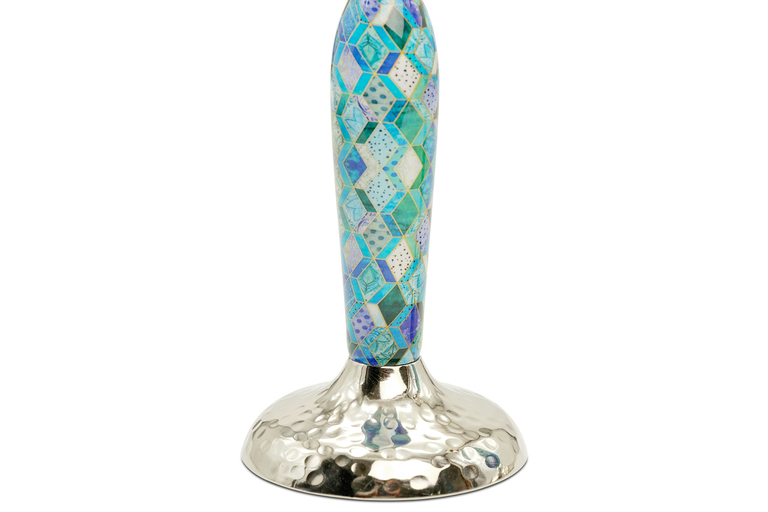 Emanuel has brought his signature charm to these soothing blue enamel and silver candlesticks. They elegantly reflect the light and peace of the Shabbat candles and are designed to hold either a pillar candle or a votive.