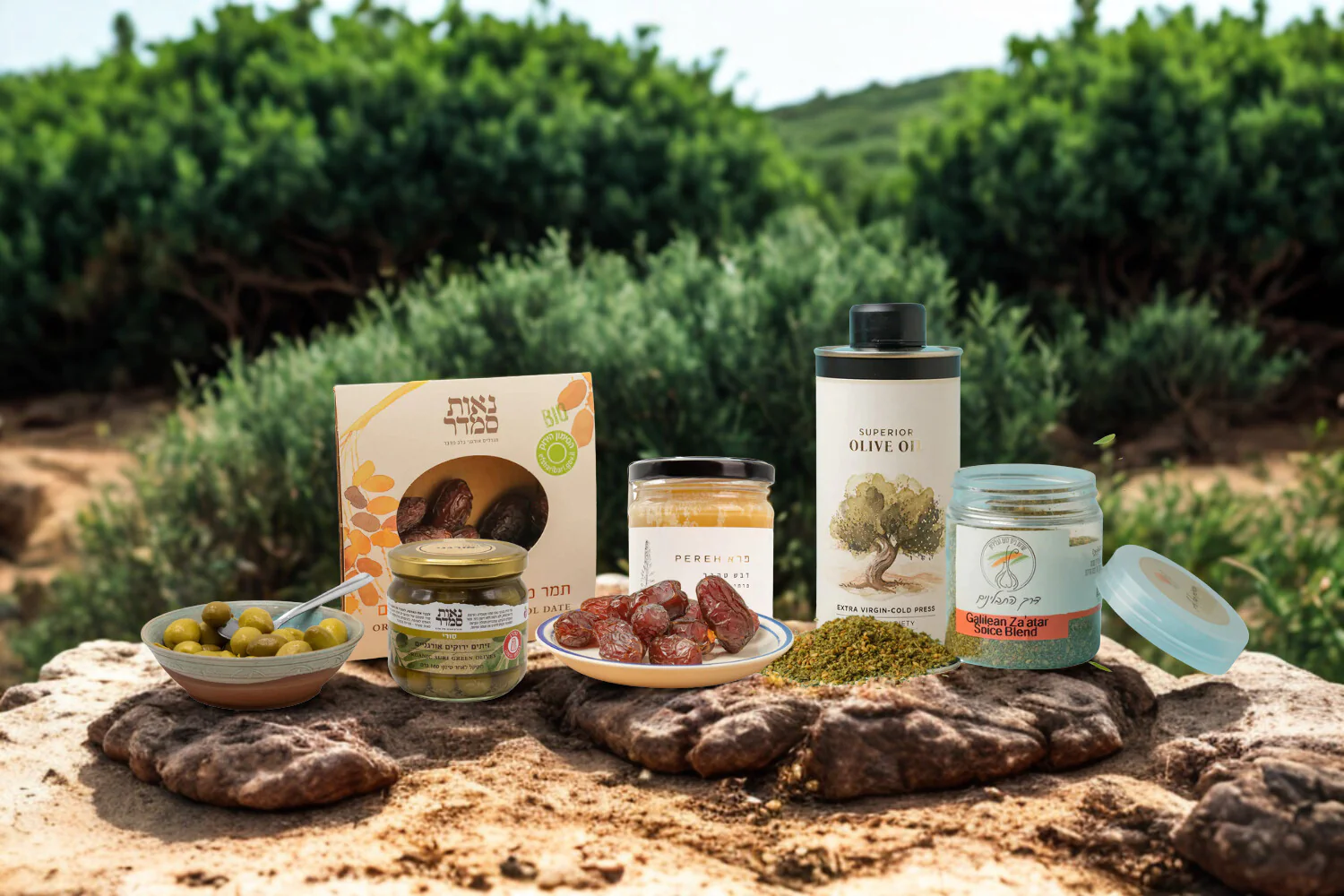 Carefully chosen to complement one another, the set includes organic Israeli Picual green olives, organic Medjool dates, pure Drimia honey, superior extra virgin olive oil, and a fragrant Galilean za’atar spice blend. Together, these essentials form the foundation of the Israeli table — flavors that have been shared for generations.