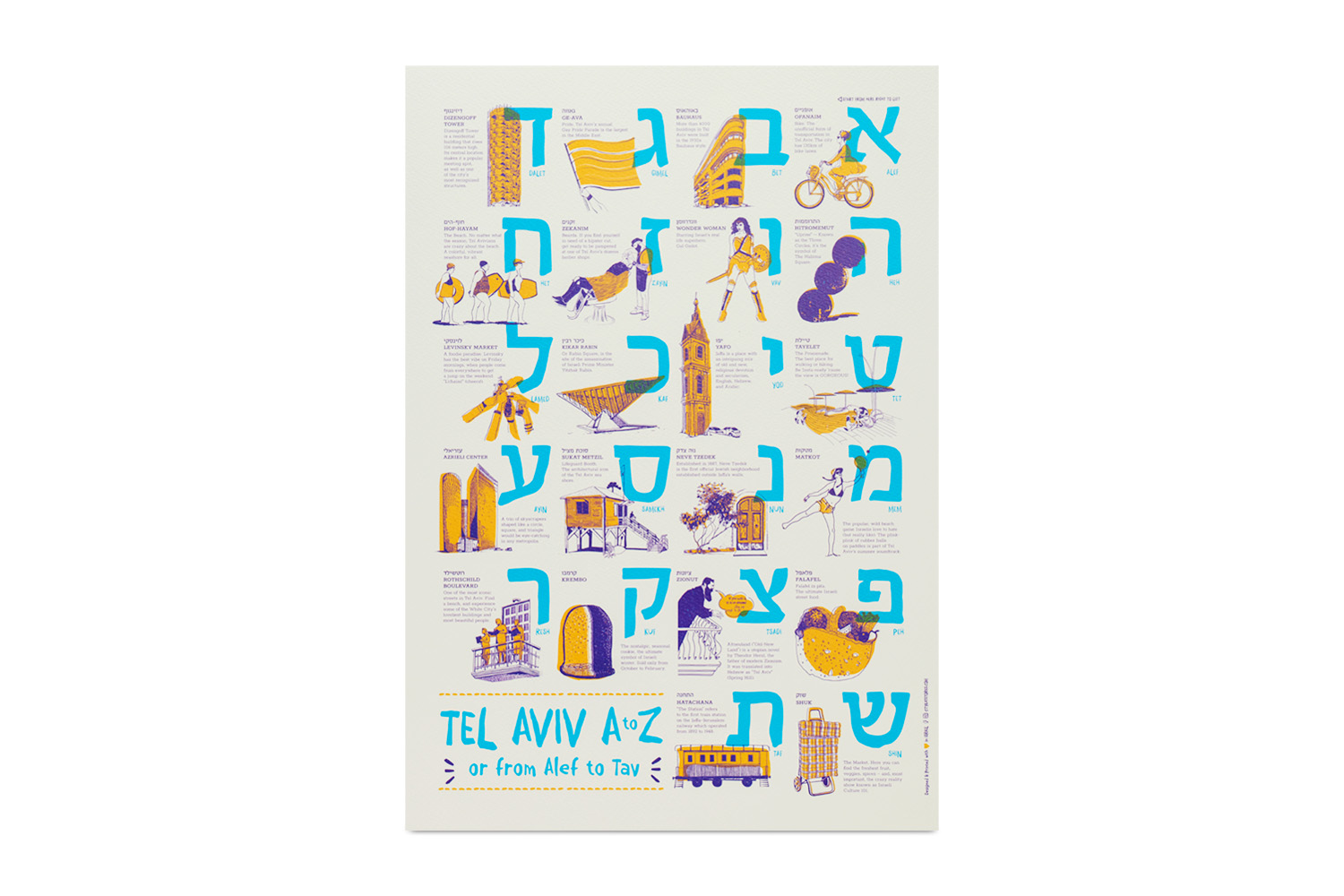 Designed and printed in Israel by CityKat Stories, this joyful digital print walks you through Tel Aviv’s culture, neighborhoods, and lifestyle using the full Hebrew alphabet. Each letter corresponds to a unique Tel Aviv icon – from Allenby Street and Bauhaus buildings to falafel, Yarkon Park, Rabin Square, and more. It’s a city tour through illustration, featuring engaging English-Hebrew captions and dynamic visuals that delight kids and adults alike.