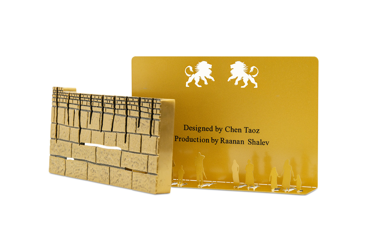 - Design: Relief of the Western Wall with cutout worshipper silhouettes and twin Lions of Judah