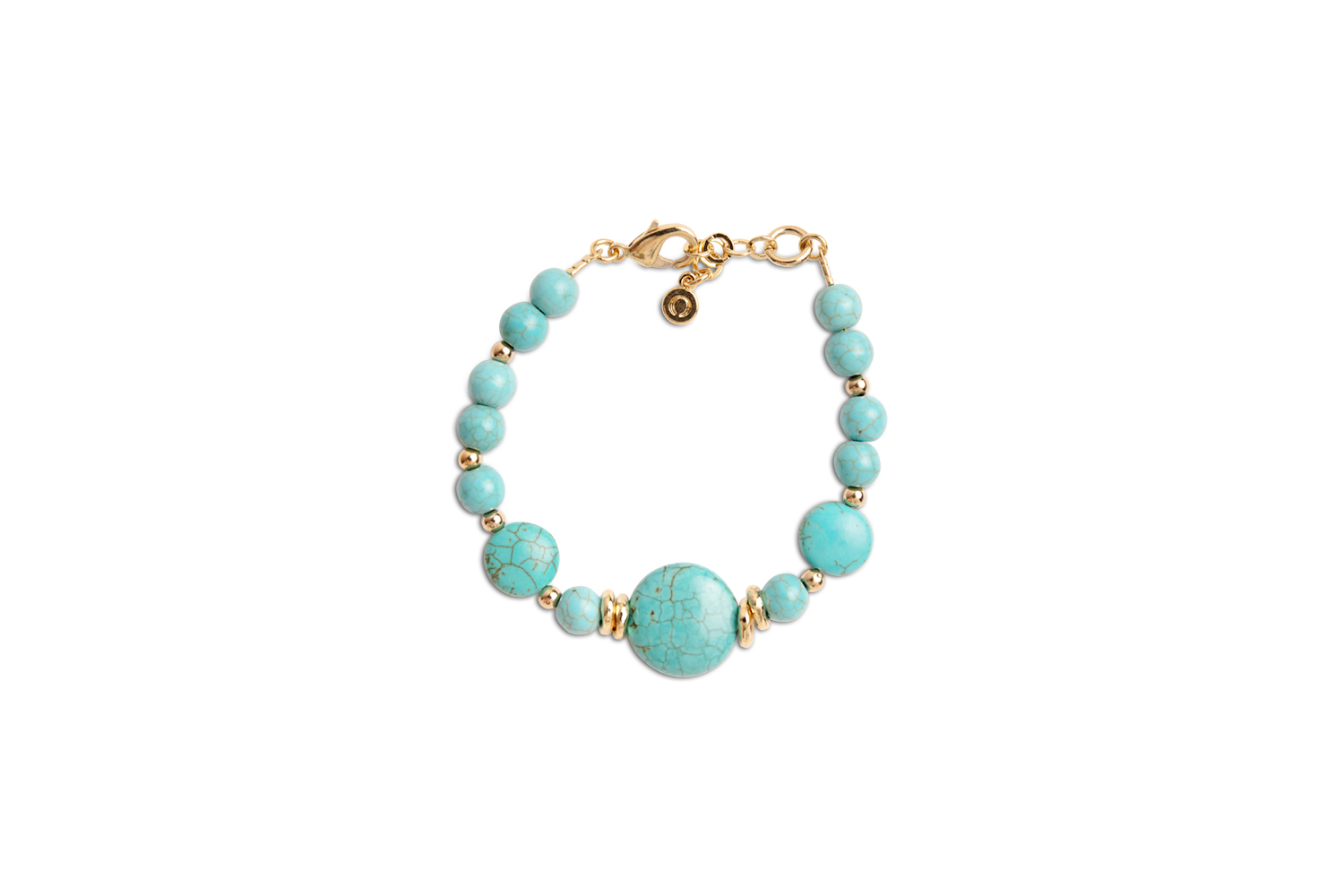 Israeli jeweler Danon is known for making high-quality, beautifully wearable jewelry. This classically styled bracelet, with turquoise stone beads in various sizes and gold-plated spacers, will add a touch of fun to any outfit you wear.