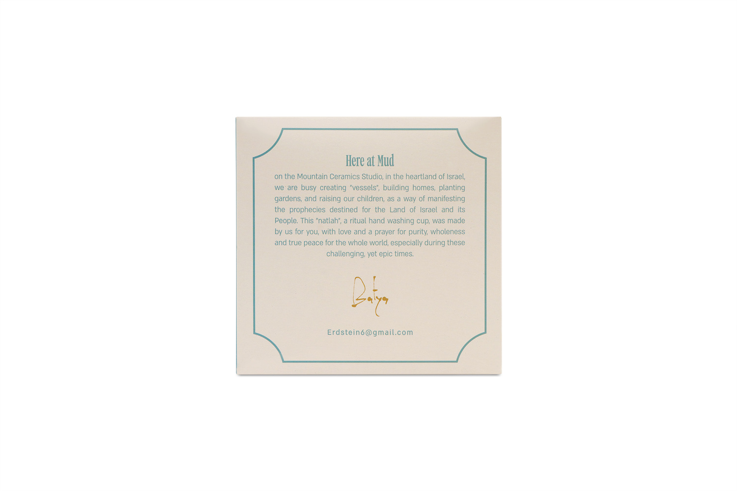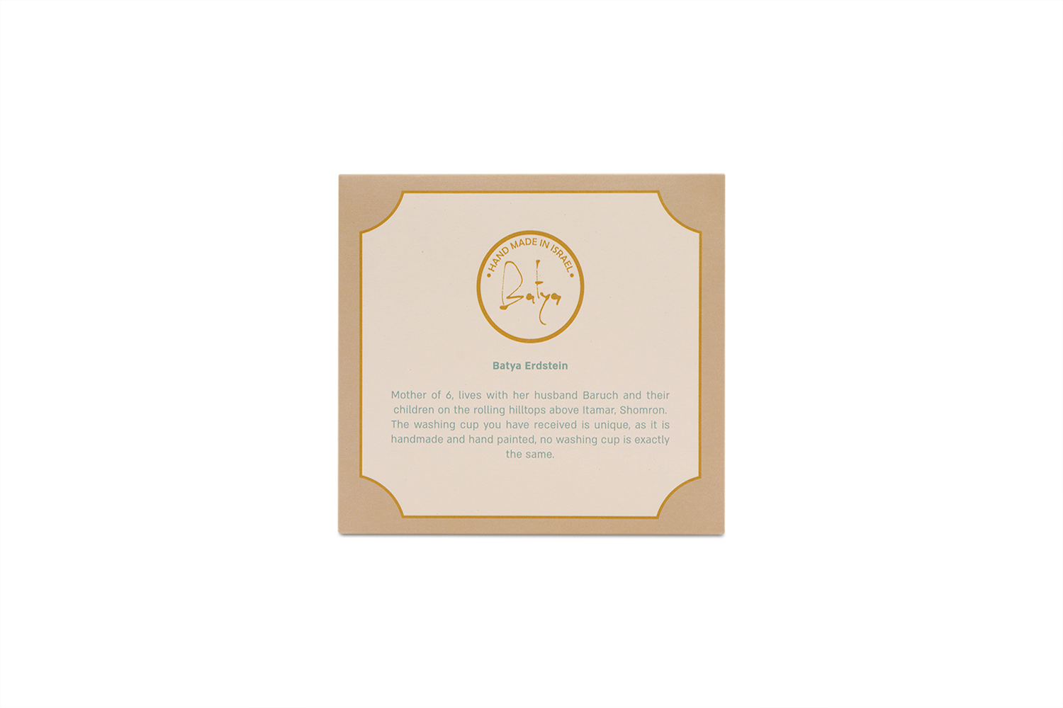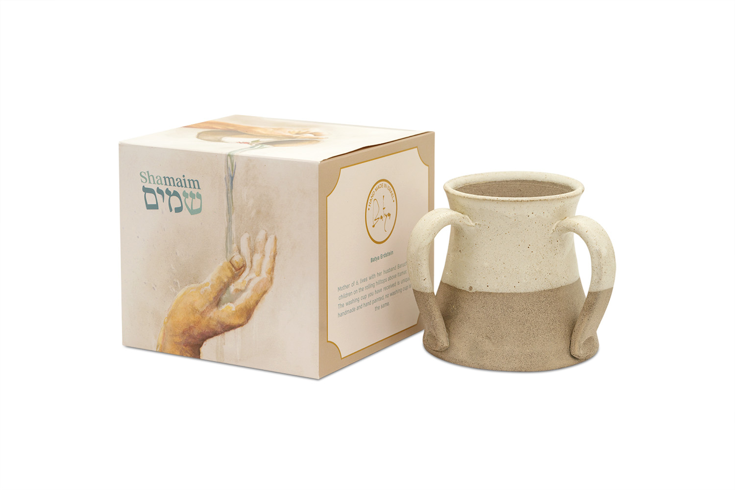 Batya Erdstein, the artist behind each vessel, works with the belief that handmade ritual objects can infuse everyday moments with intention. As a mother of six living in a community rooted deeply in the land, her artistry reflects faith and resilience. Every cup she creates carries a sense of home, purpose, and connection — a reminder that the simple act of washing hands can be elevated when using a piece crafted with love and prayer. Durable, balanced, and easy to hold with its double handle design, this washing cup is ideal for netilat yadayim and daily ritual use. Its handmade nature ensures that no two cups are identical, giving each customer a unique vessel that holds the imprint of the artist who created it.