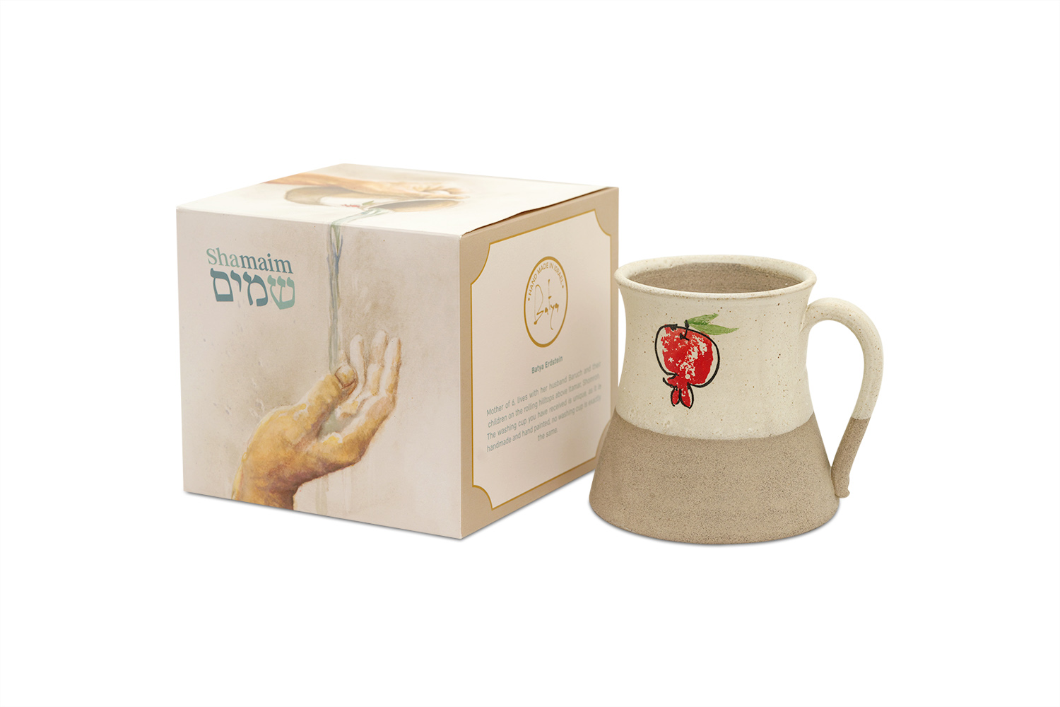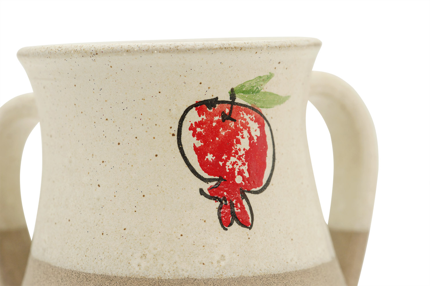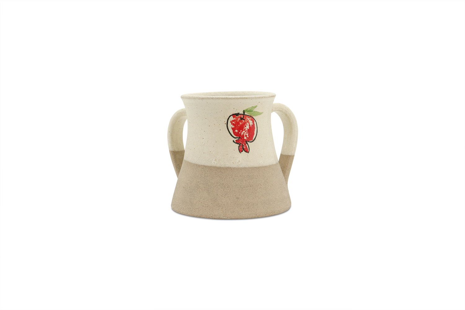 This handmade ceramic washing cup brings the warmth and spirit of Israel into your daily ritual. Created by Batya Erdstein in the Mountain Ceramics Studio in the Shomron region, each cup is shaped, glazed, and painted by hand, making every piece one of a kind. The natural clay body and soft glaze evoke the colors of the surrounding hills, while the hand painted pomegranate adds a symbolic touch of blessing and abundance.