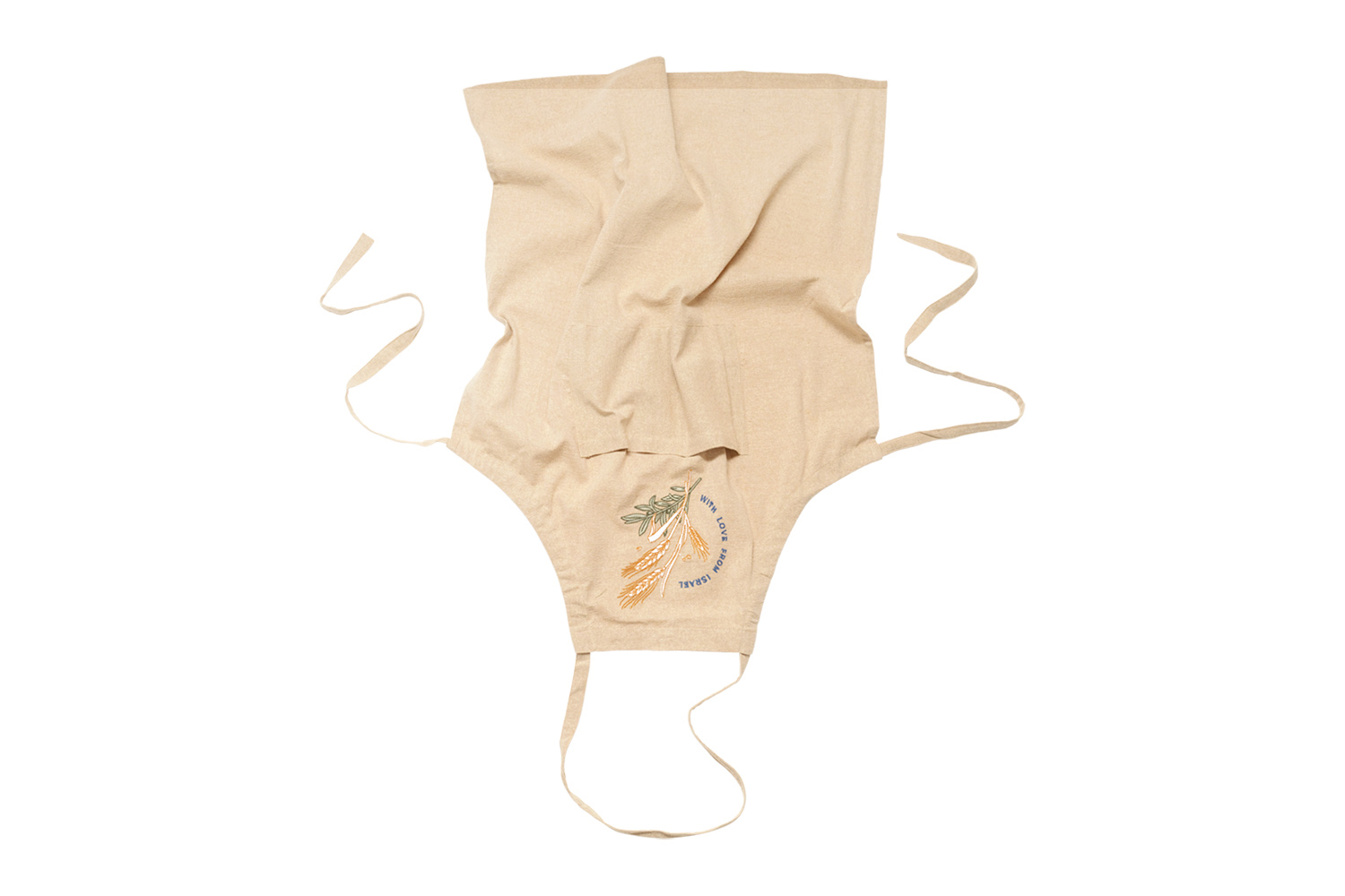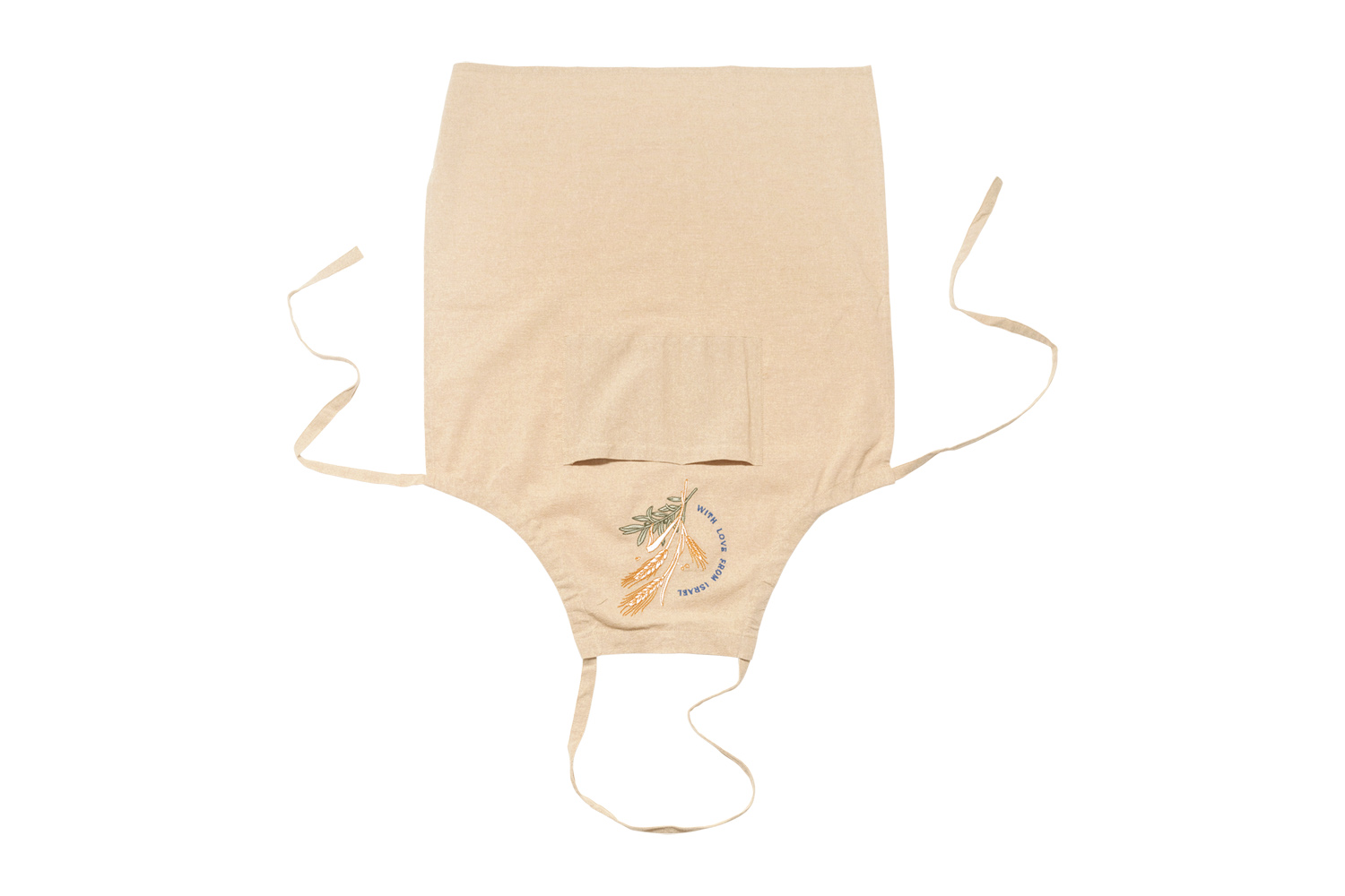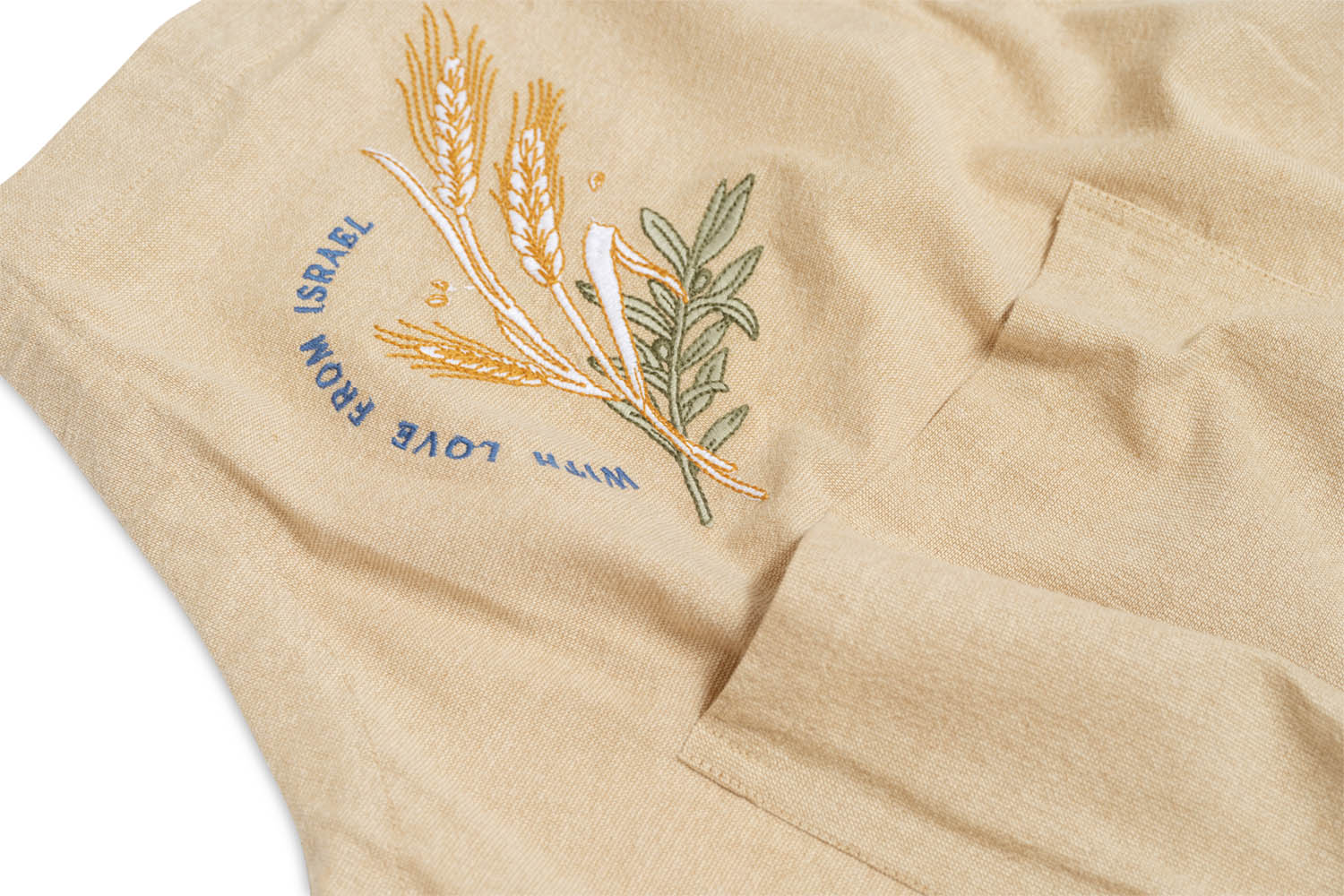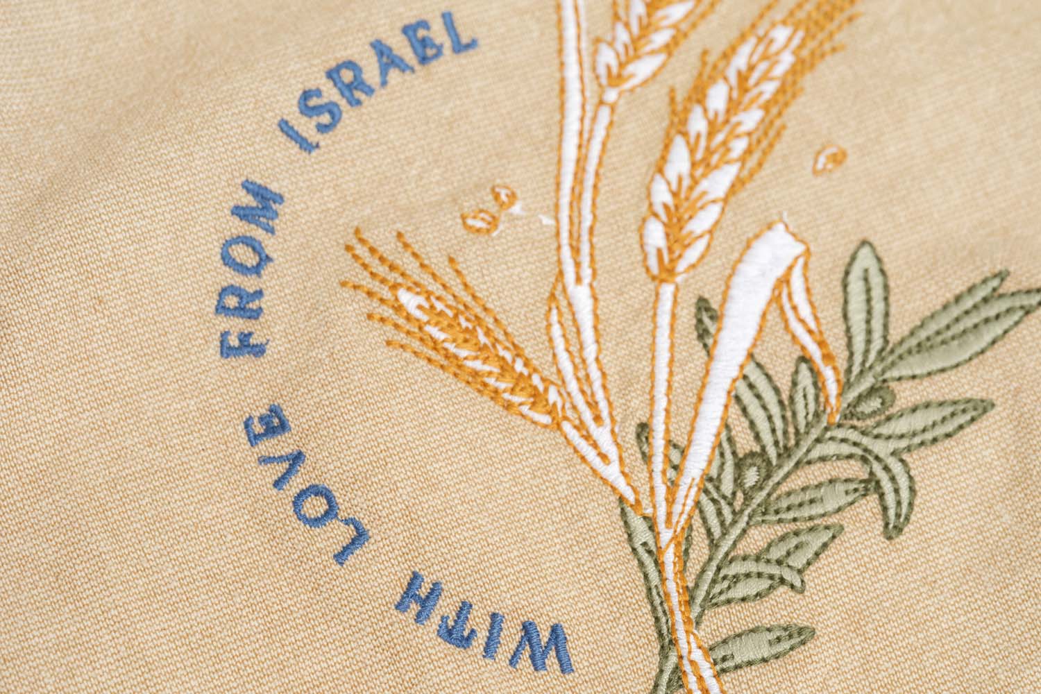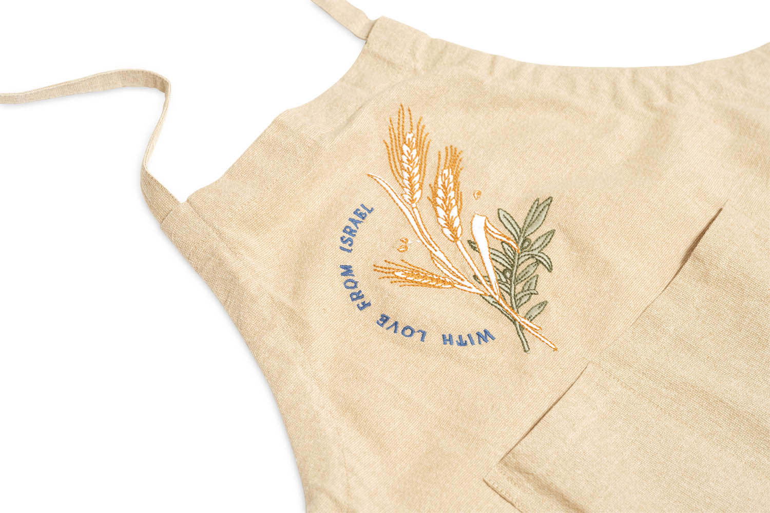 What makes it truly special is the delicate embroidery on the front: golden wheat stalks and olive branches, two ancient symbols of abundance, peace, and connection to the land of Israel. Surrounding the motif are the words “With Love from Israel”—a message that turns this simple kitchen staple into a heartfelt statement of support.