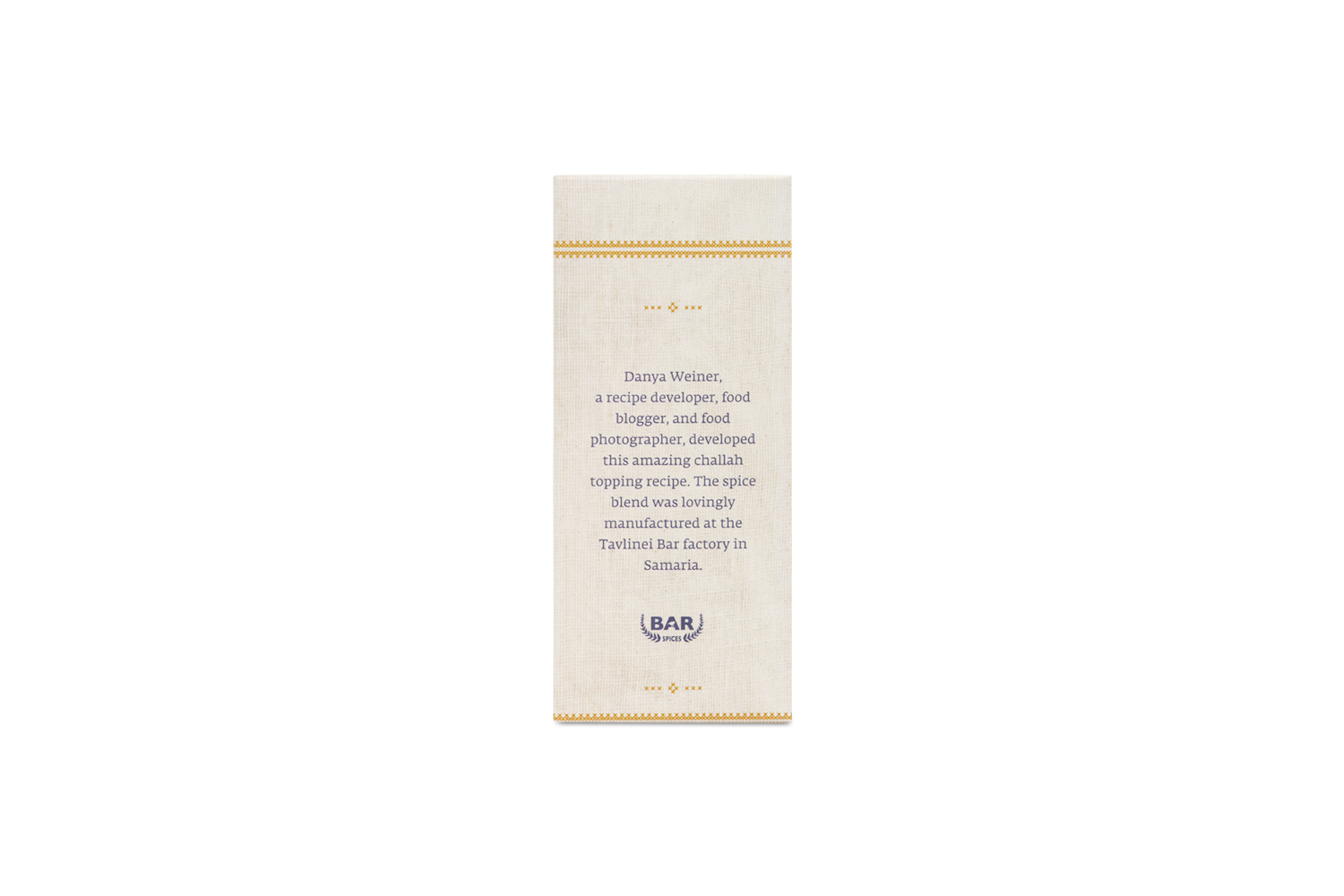 Bar Spices is a much-loved Israeli spice company located in the Barkan region in Samaria. Barak and Dana Berman established their business with a shared vision of creating unique and unusual spice blends. They have tapped into the rich knowledge and traditions of Middle Eastern cooking to create special spices and reflect an Israeli sensibility.
