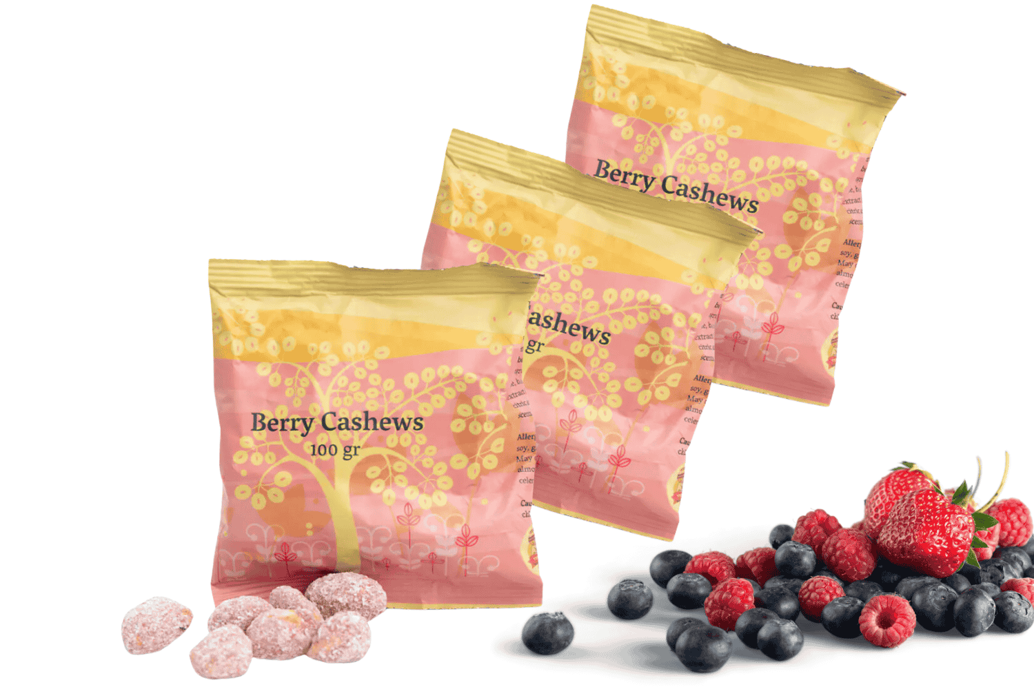 Each bite is a delicious taste sensation with crunchy cashews wrapped with a berry and blueberry finish. These Berry Cashews are the perfect blend of wholesome nuts and the irresistible sweetness of berries. With each bite, you'll experience a tasty combination of rich, nutty ...