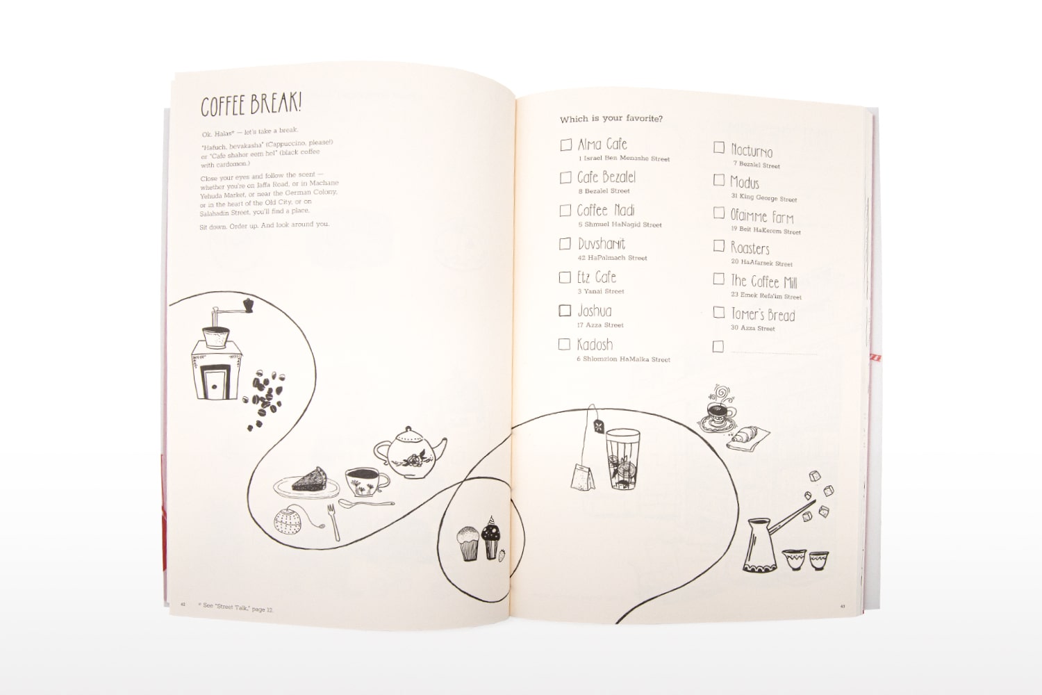 This charming guide and activity book is a blend of a coloring book, city guide, and journal, all in one. You can use the Tel Aviv City Stories guide to lead you through the White City, showing you where all the secret gems, hidden places, and local favorites are...